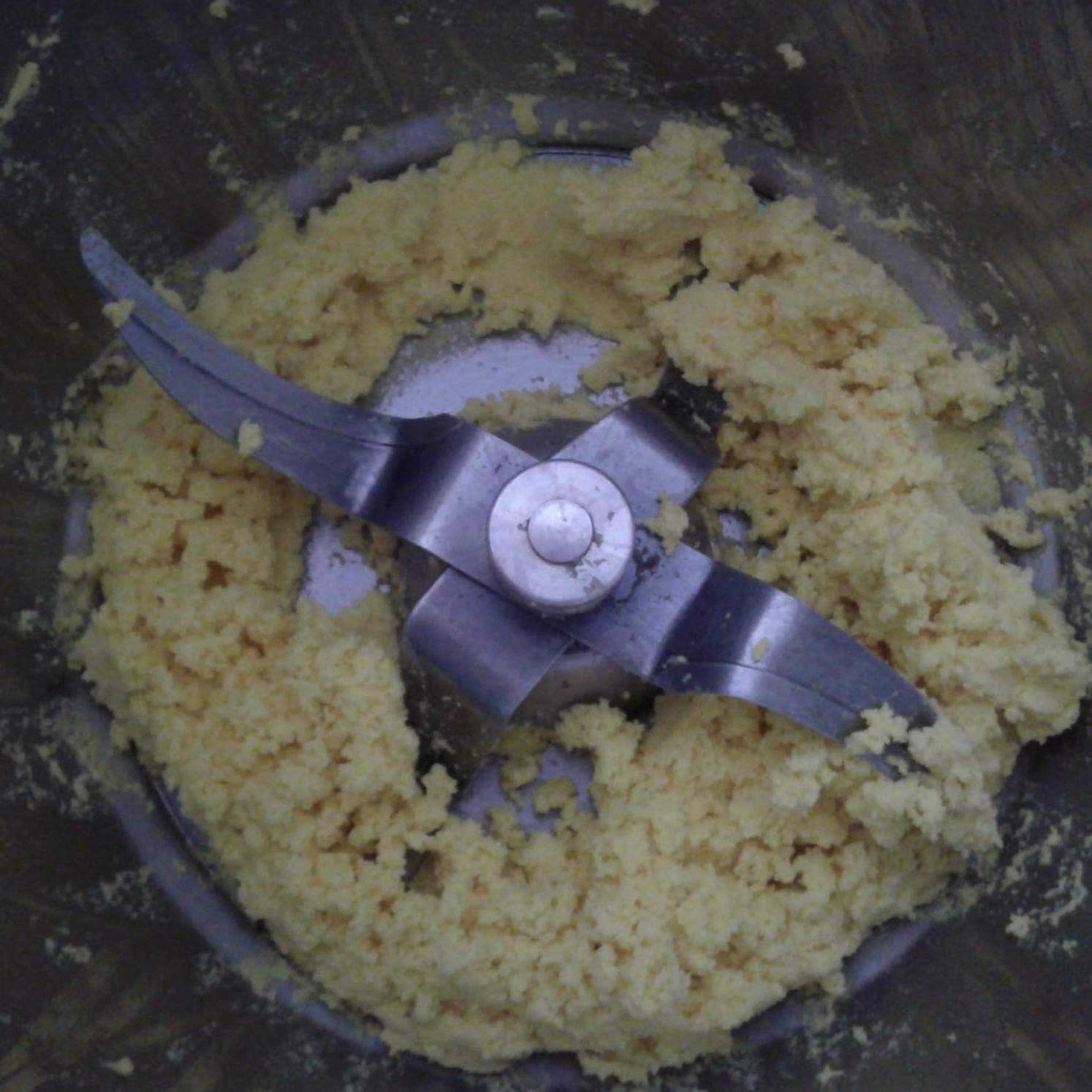 "coperchio chiuso" farina e burro e impastate per 10 sec., vel. 5; unite gli altri ingredienti, comprese le mandorle tritate, e finite di impastare per 30 sec., vel. 5.Prendere l'impasto ottenuto, compattarlo un poco con le mani e stenderne circa i 3/4; foderarvi una tortiera precedentemente imburrata o rivestita di carta forno. Farcire ora la torta con la marmellata e con la pasta rimasta preparare sette "collinette" spesse non più di un centimetro da porre sopra la marmellata.