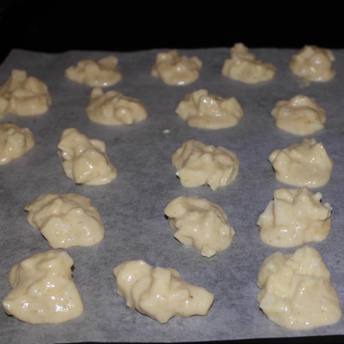 Con l'aiuto di un cucchiaino mettere dei ciuffetti di impasto su una teglia con carta forno. Cuocere a 180^ forno ventilato per 10 minuti (fino a raggiungere la giusta doratura)