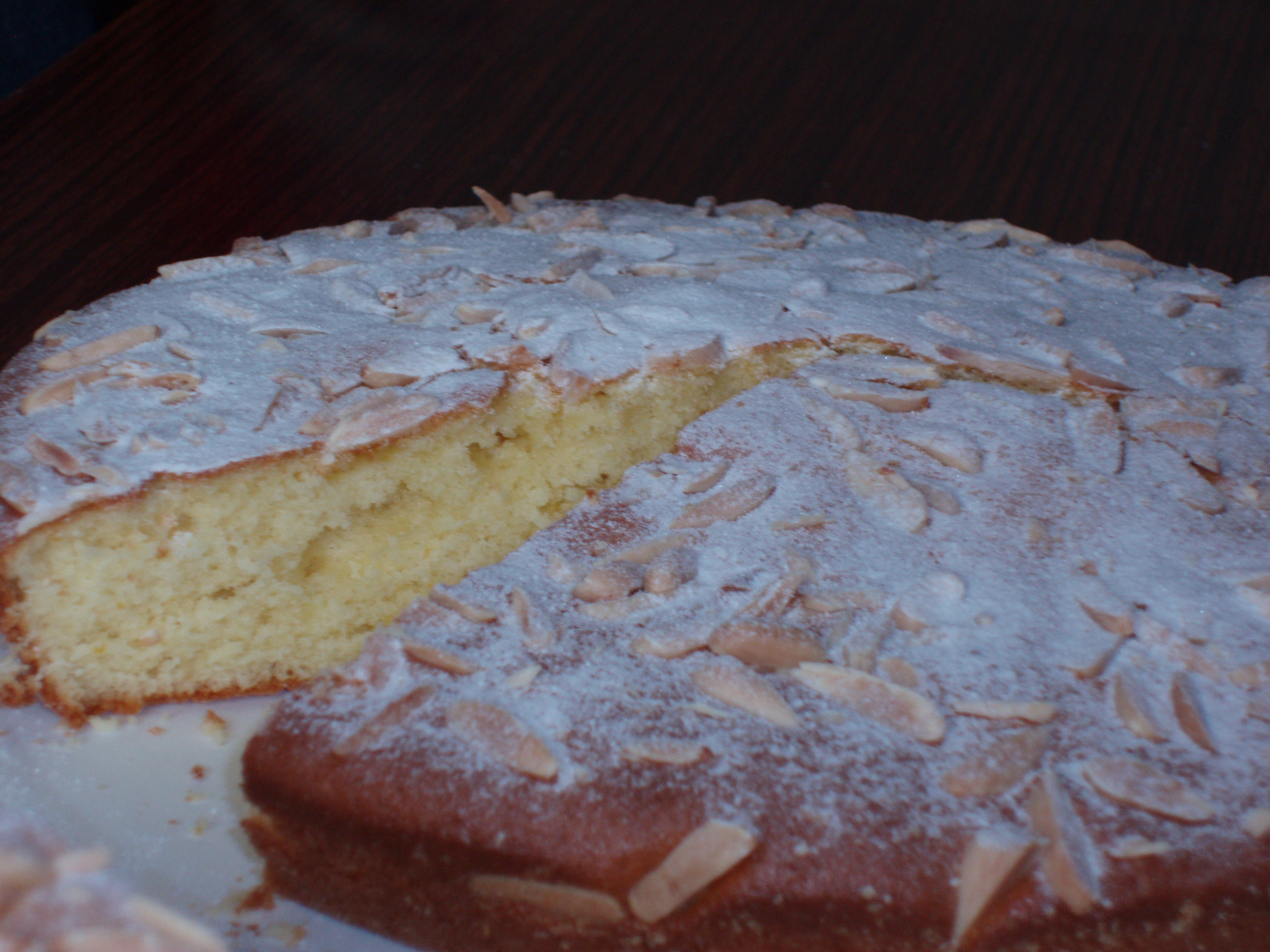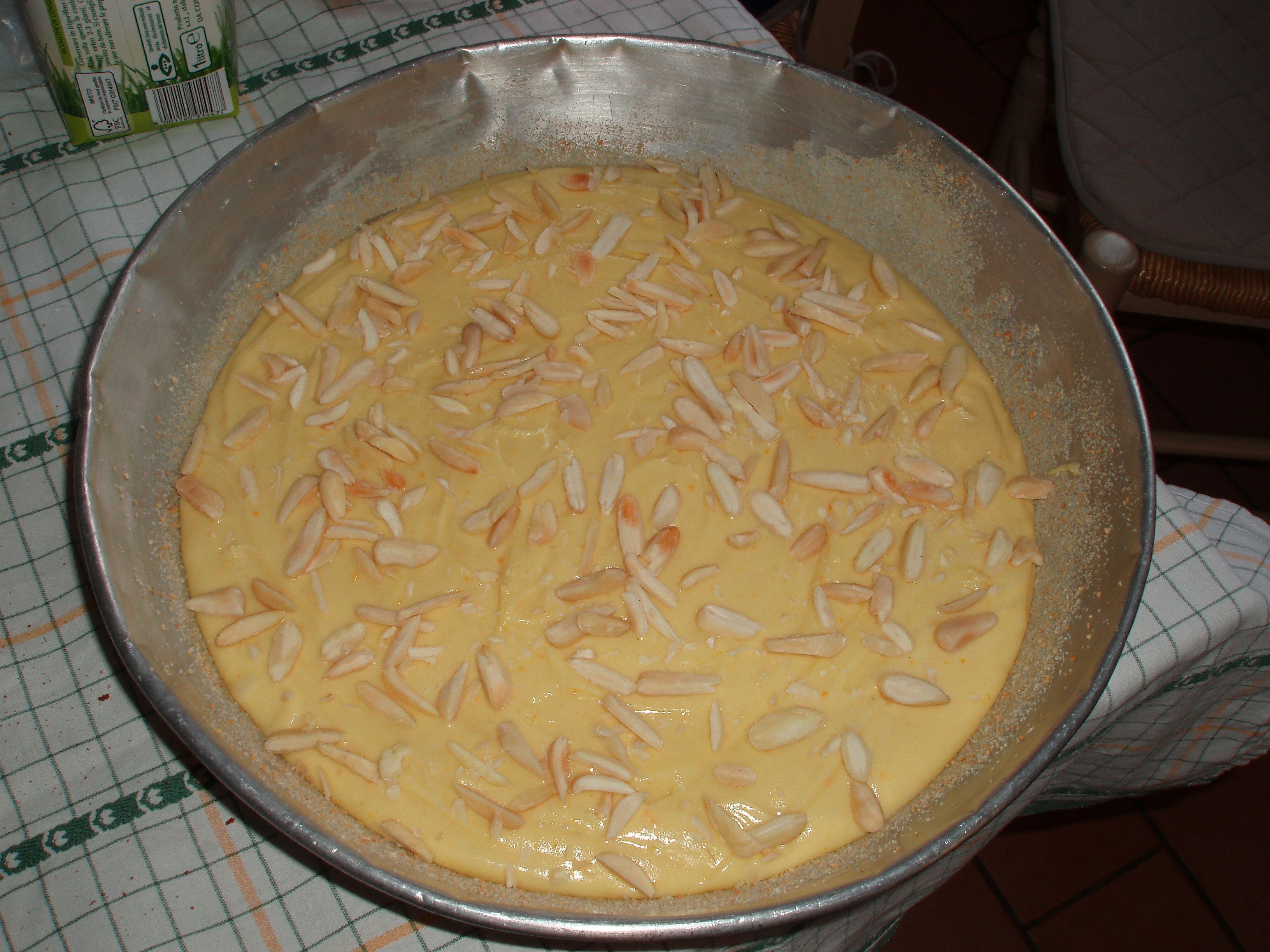 Mettere tutto in uno stampo, diametro 28 e cospargere con le mandorle tagliate a lamelle;