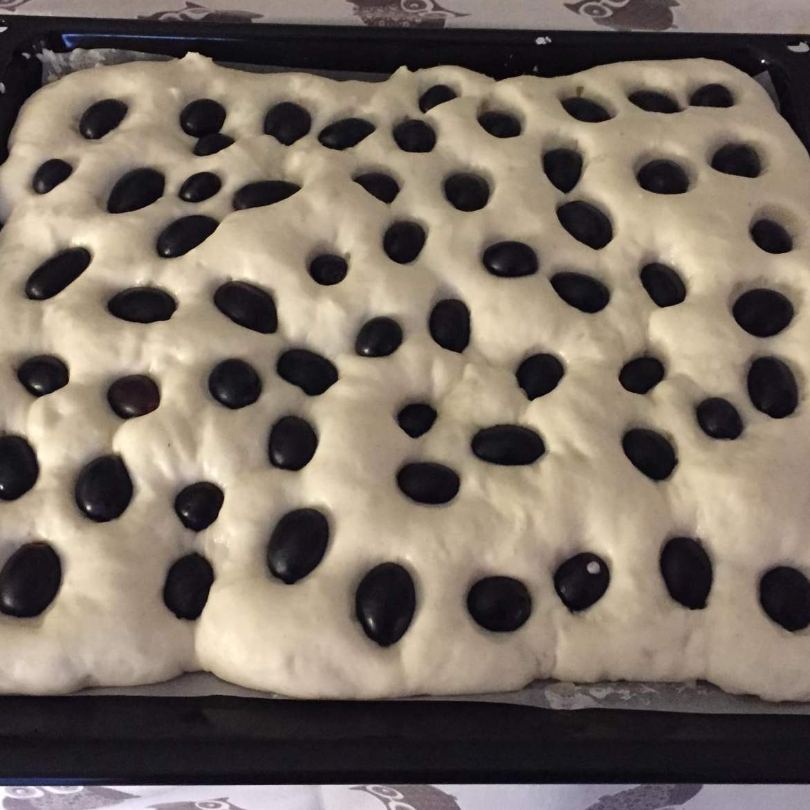 Distribuire i chicchi d'uva premendoli leggermente nell'impasto e lasciar lievitare in forno spento con luce accesa per almeno un altra ora e mezza.