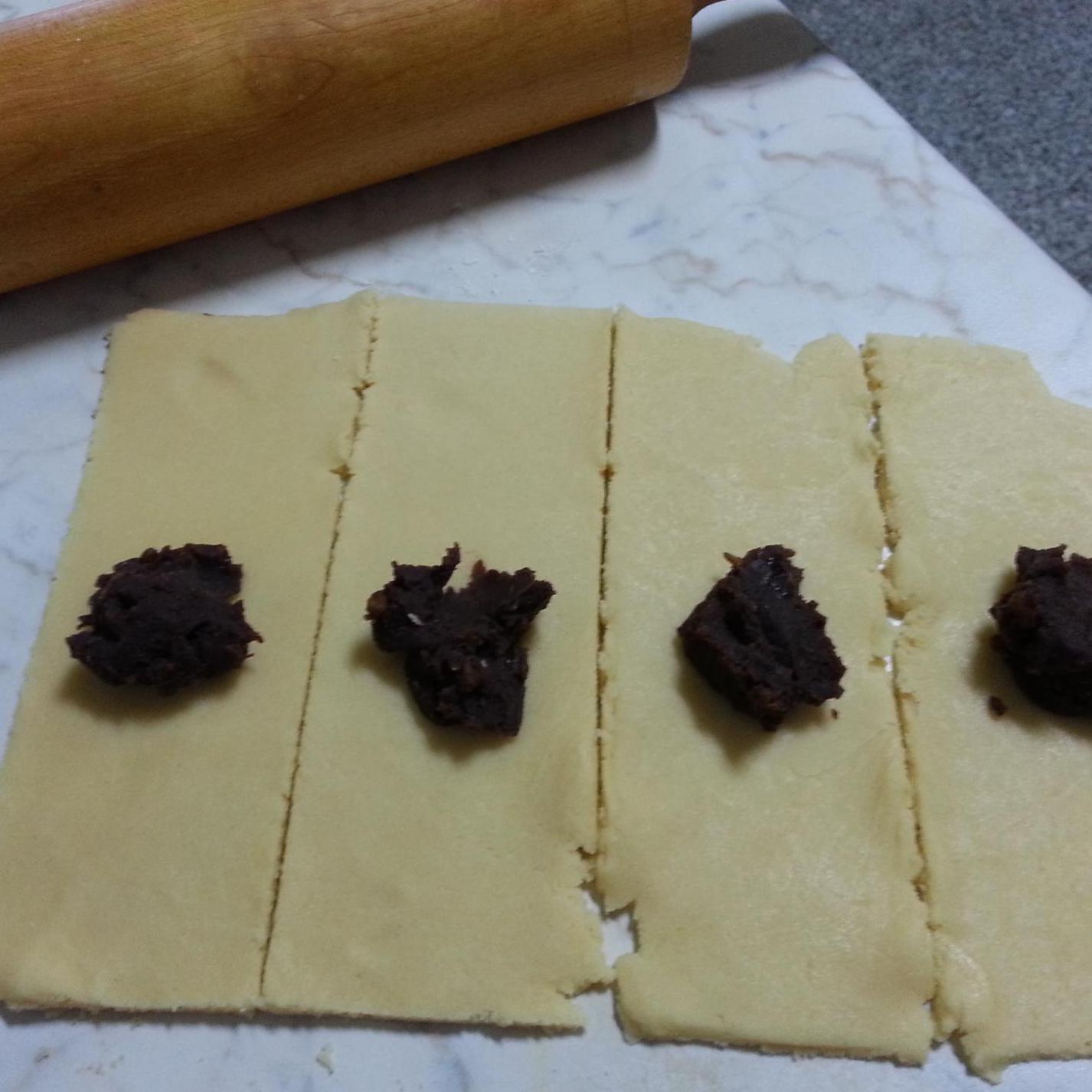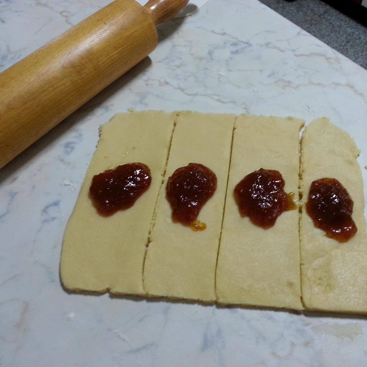 Riempire tutti i rettangoli di pasta con la marmellata e richiudere i 2 laterali sovrapponendoli.