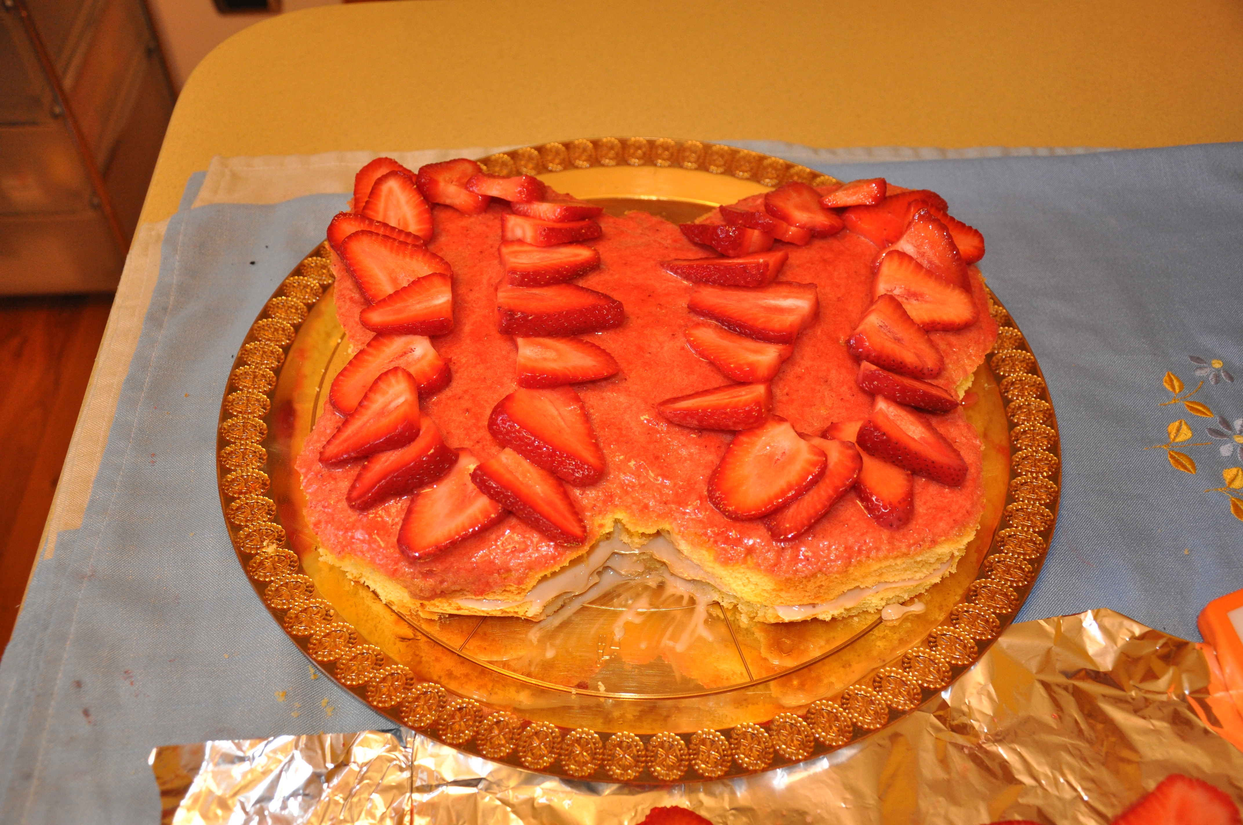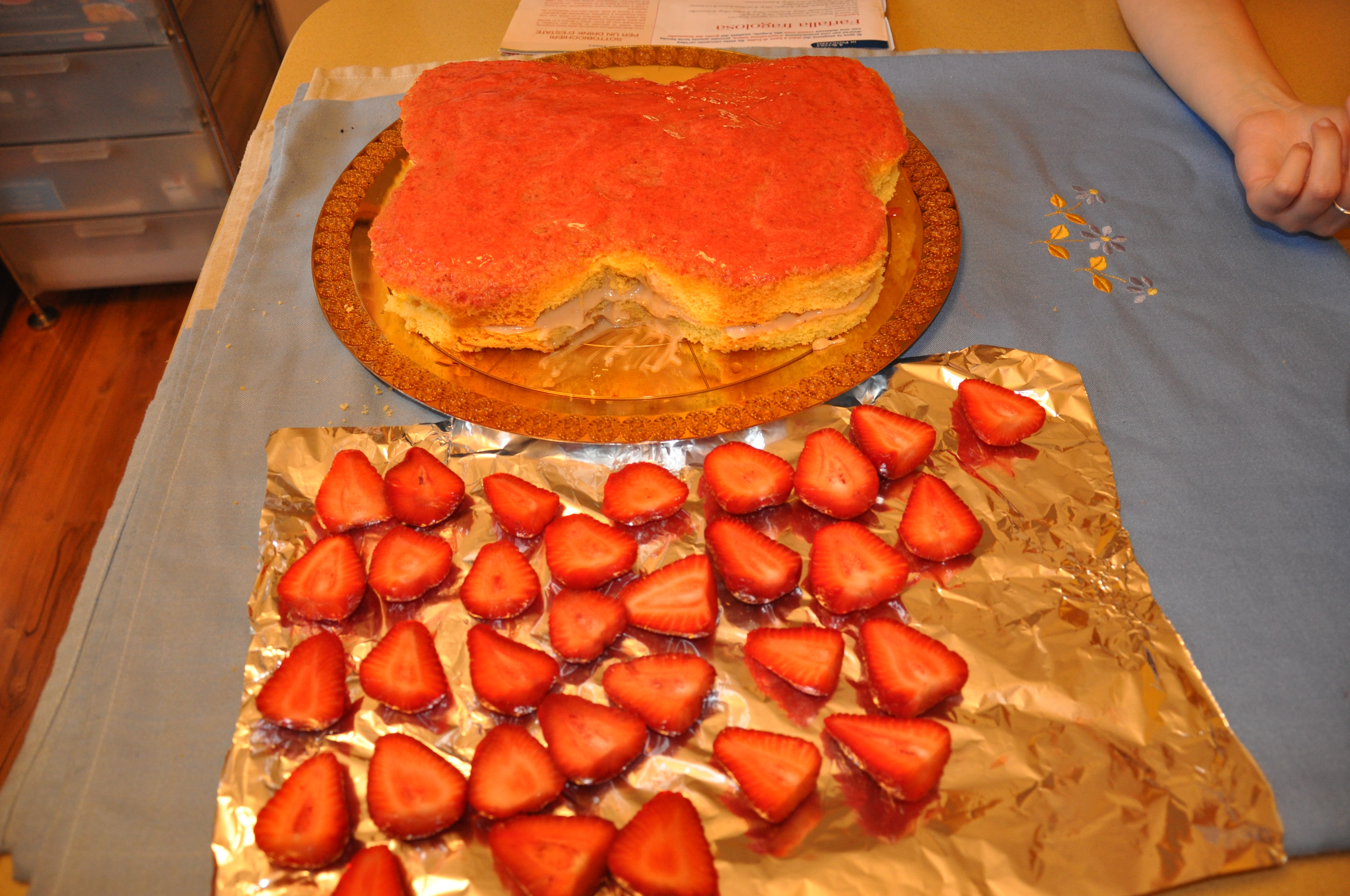 Tagliate orizzontalmente la farfalla di pan di spagna dividendola in due parti; irrorate una parte con la bagna al limoncello, versate sopra la crema rosa e ricoprite con l'altra metà del pan di spagna. Irrorate ancora con la bagna e completate versando la gelatina tiepida prima di ricoprire con le fragole tagliate.