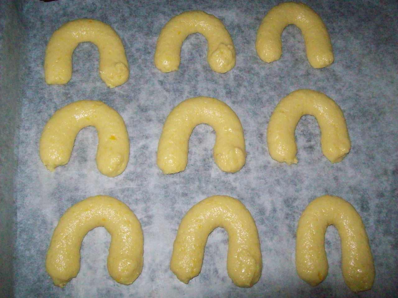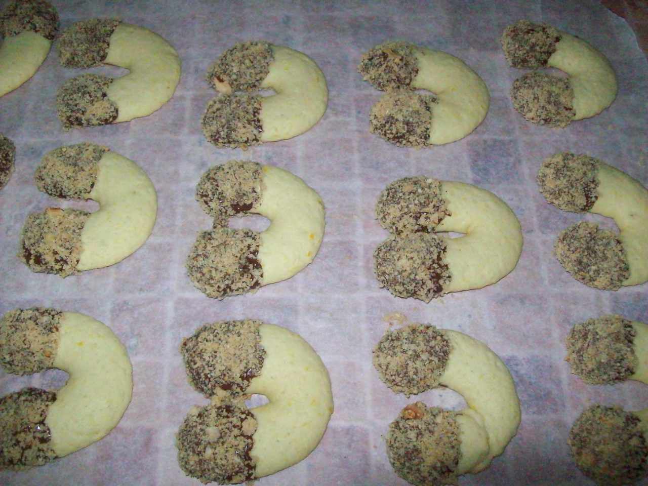 "coperchio chiuso" mettere la scorza e lo zucchero: 10sec / vel 8. Aggiungere tutti gli altri ingredienti: 30sec / vel 5. Con l'aiuto della siringa per i dolci, formare dei biscotti. Cuocerli nel forno caldo: 190° / 10min circa. Lasciarli a raffreddare. Intingere le due etremità nel cioccolato sciolto, poi nella granella di nocciole. Lasciare a rassodare.
