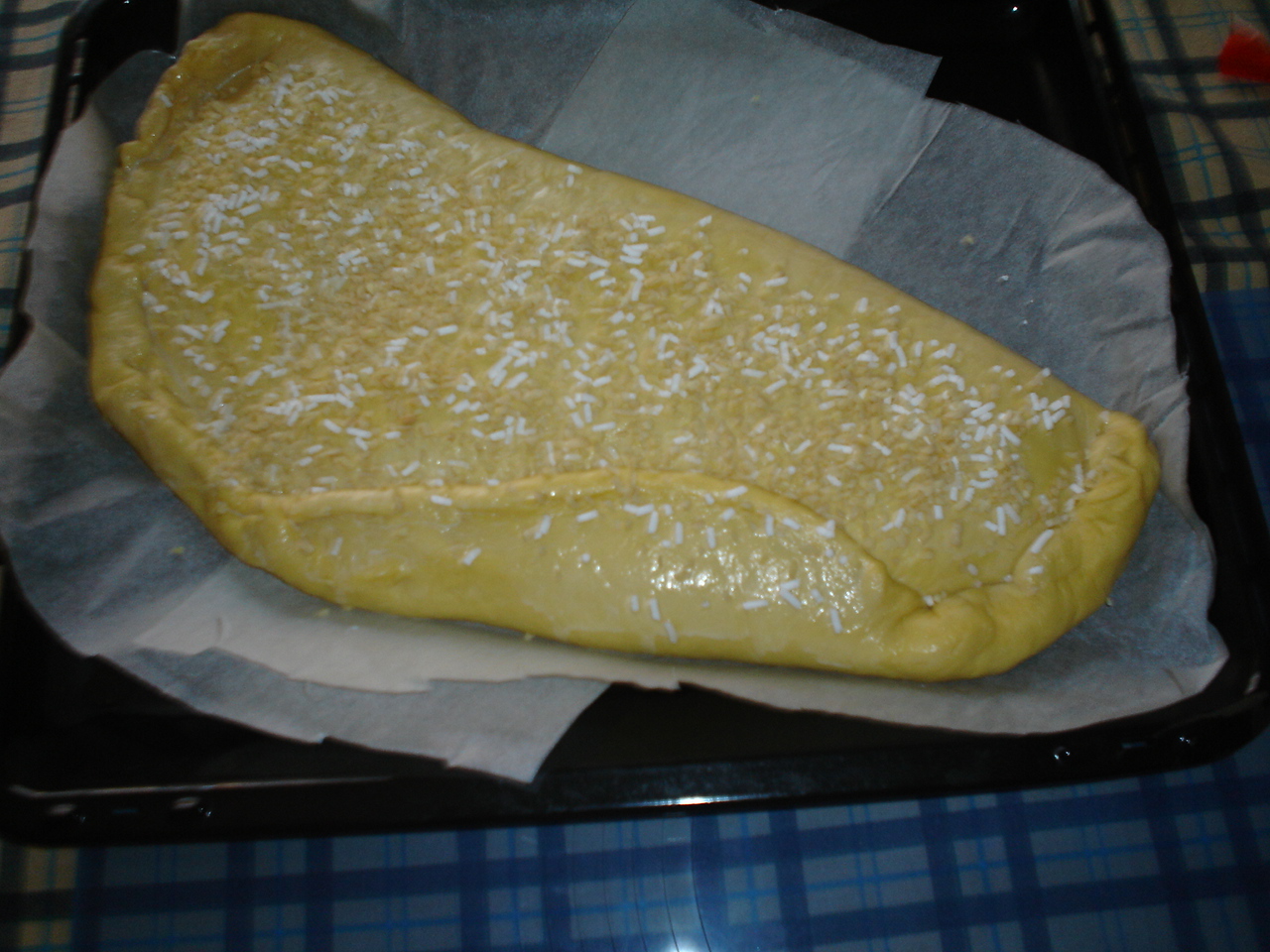 Stendere su metà della pasta la crema appena intiepidita, chiudere a portafoglio sovrapponendo la metà di pasta “libera” dalla crema, pizzicare bene i bordi magari creandoun bordino attorcigliato per impedire in cottura alla crema di fuoriuscire. Pennellare la superficie con latte, cospargere con zucchero in granella e mandorle a lamelle o granella di mandorle. Lasciare lievitare ancora circa 30 minuti lontano da correnti d’aria (io nel forno spento) su una teglia da forno (misura indicativa 42x32).
