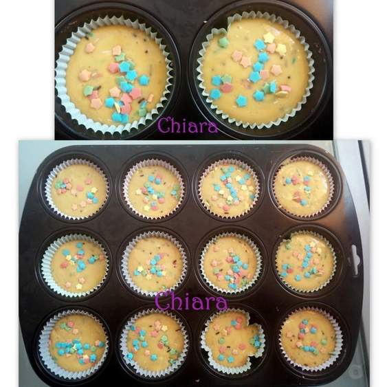 4. Riempire i pirottini con un po' di impasto e mettere altri confettini/mompariglia.