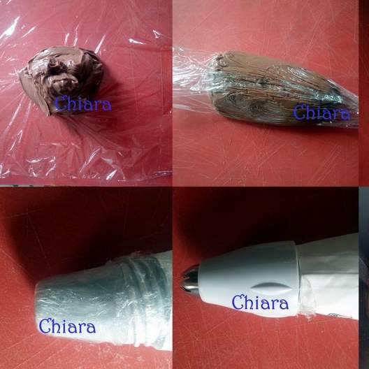 9. Per non sporcare la sac a poche, avvolgete il frosting nella pellicola trasparente e formate un salsicciotto; fate uscire un estremità dalla bocca della sac a poche.
