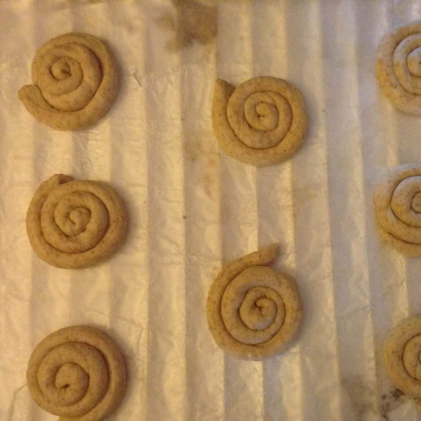 Infine lasciare lievitare su una placca da forno ricoperta da carta fino al raddoppio infine cuocere a forno ventilato a 220° per 5/6 min poi abbassare a 180° per eltri 6/8 min, una volta tirati fuori dal forno sciogliere un po' di marmellata con un pò di acqua e spennellare sopra le girelle aggiungere a piacere scaglie di mandorle o zucchero a granella.