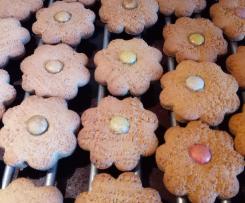 Insieme allo zucchero e alla scorza di agrume, tritare pezzetti di zenzero e di cannella, oppure unire alle farine un cucchiaio di zenzero e uno di cannella in polvere. Formina a fiore, con goccia di cioccolata al centro, o a piacere.