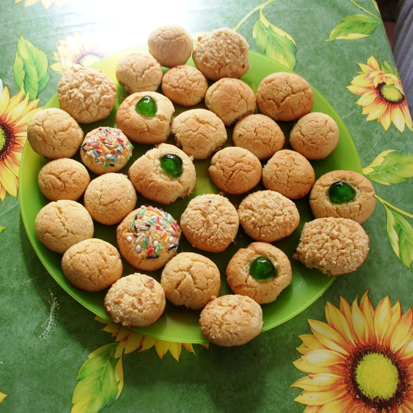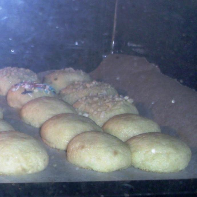 3. Formare delle palline della grossezza di una noce, appiattirle un po’ e disporle, non troppo vicine, sulla lastra del forno foderata con carta da forno. Spennellare i biscotti con latte e cospargerli di zucchero granella.mettere delle ciliegie