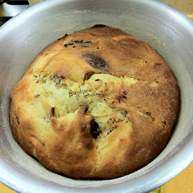 A questo punto per non perder tempo e non far sgonfiare l'impasto ho imburrato ed infarinato una teglia da panettone del diametro di 20 cm, ho tagliato con le mani l'impasto che fuoriusciva dallo stampo del pandoro e ho acceso il forno a 175C° per 30 min. Dopo 15 min dall'inizio della cottura, copro i due composti con dell'alluminio, per non far bruciare troppo la superfice.