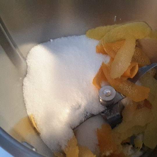 1. pelare i limoni e le arance mettere nel coperchio chiuso"coperchio chiuso"  con lo zucchero e tritare (non polverizzare) per 10 sec vel 6