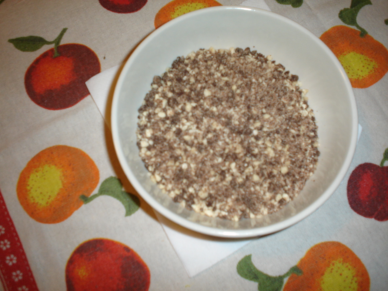 senza lavare il boccale, inserire il cioccolato spezzettato e le mandorle, e tritare 8 sec. vel. 5/6. Controllare il trito ed eventualmente fare un altro passaggio di un paio di secondi smpre a vel. 5.