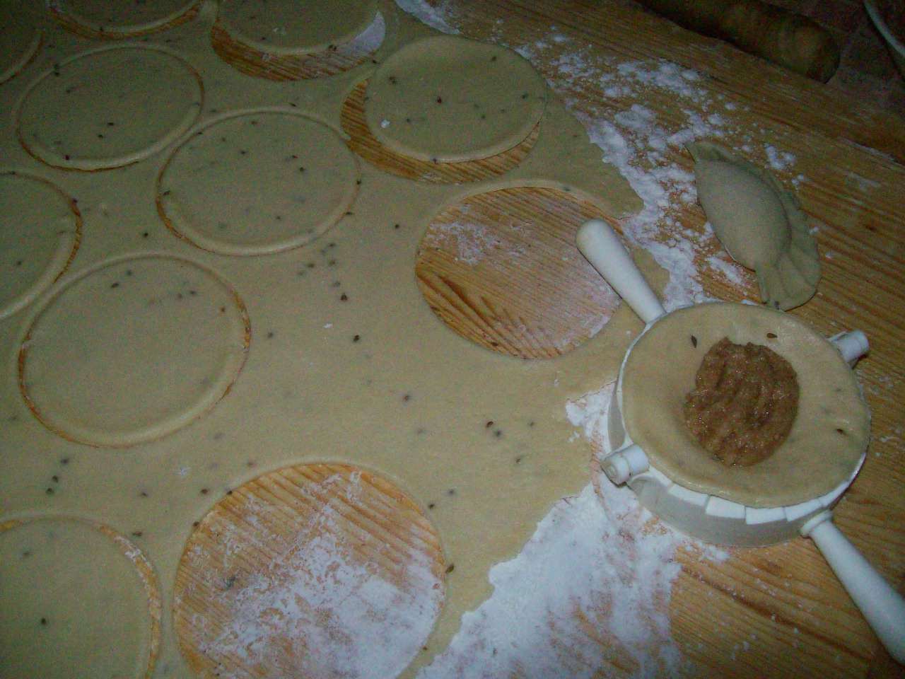 "coperchio chiuso" mettere le mele: 5sec / vel 4. Aggiungere tutti gli altri ingredienti: 10sec / vel 3. Stendere la pasta, ritagliare dei dischi, mettervi il ripieno, chiudere. Spennellare la superficie con l'uovo. Cuocere nel forno caldo: 190° / 15-20min, finchè non saranno leggermente dorati.