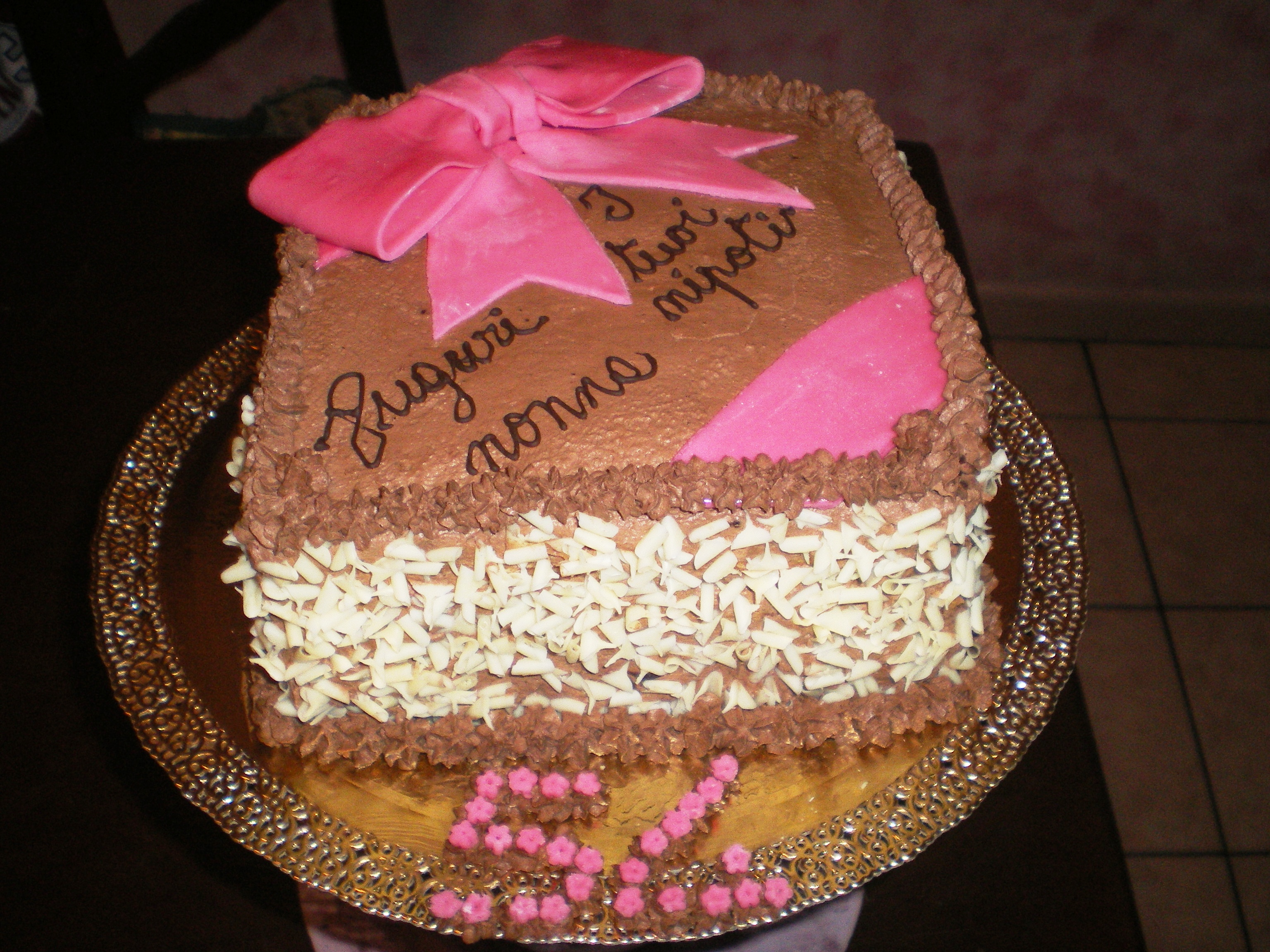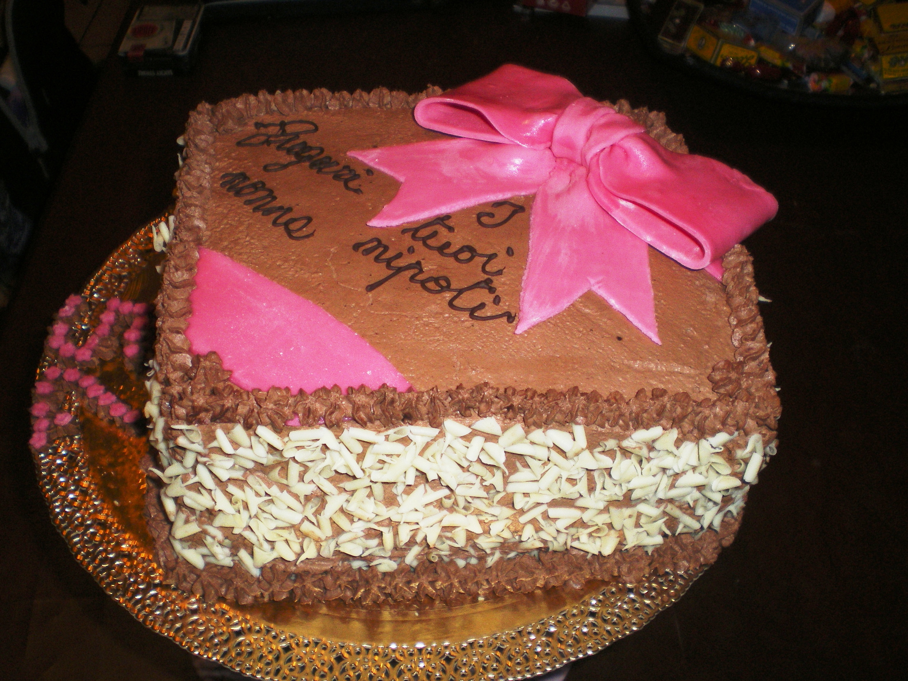 Assemblaggio torta: Io ho alternato 3 sfoglie con mousse al cioccolato e ho coperto tutto con la mousse restante. Ho decorato i bordi con riccioli di cioccolato bianco e sopra ho aggiunto un fiocco fatto con pasta di zucchero.