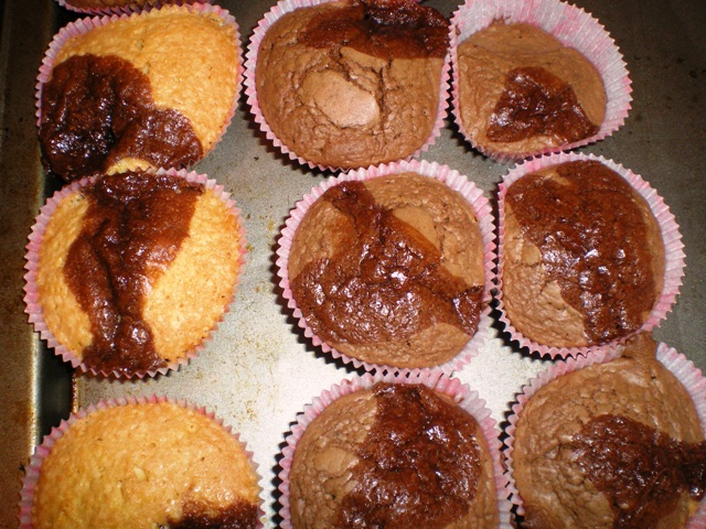 Riempire i pirottini con metà dell'impasto, aggiungere su ogni muffin mezzo cucchiaino di crema gianduja.