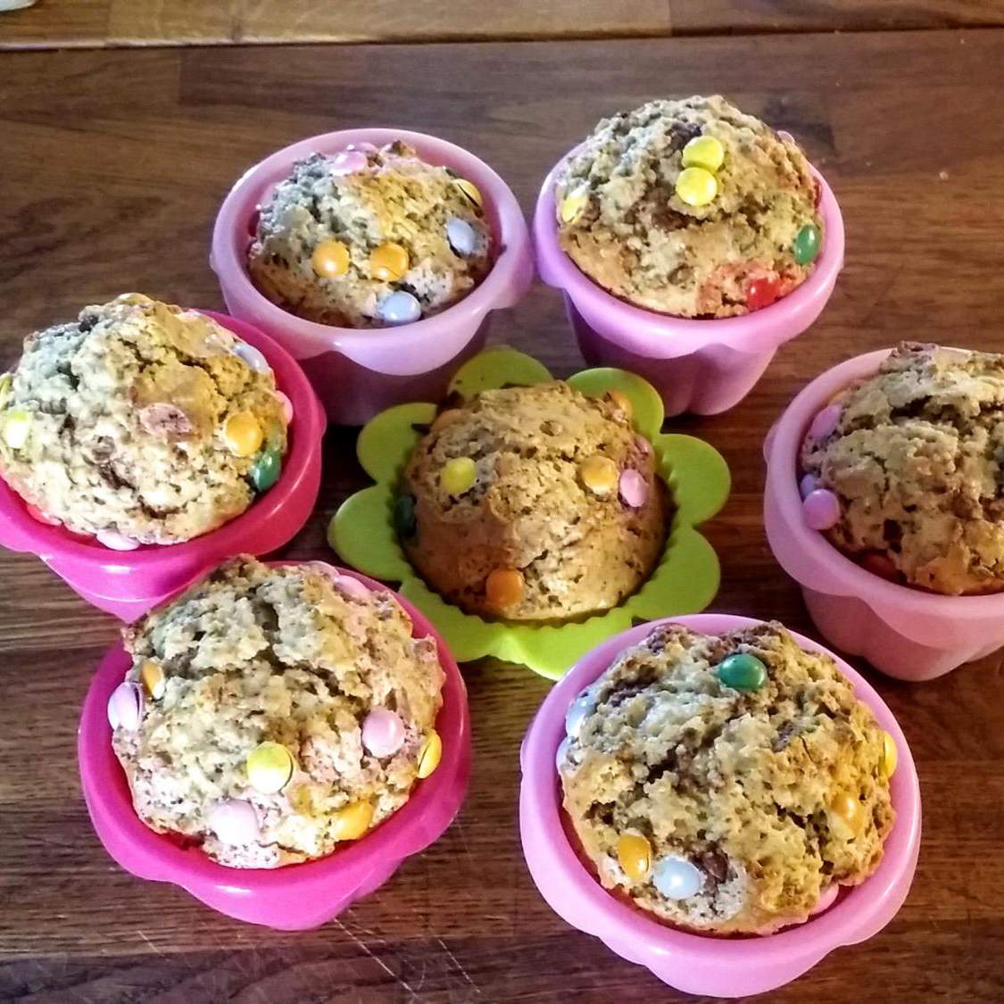 Versare l'impasto così ottenuto sul panettone sbriciolato e mescolare accuratamente. Riempire 3/4 i pirottini (in silicone o in carta da forno), decorare con i mini cioccolatini colorati e cuocere in forno caldo 180°C per 15-20 minuti.