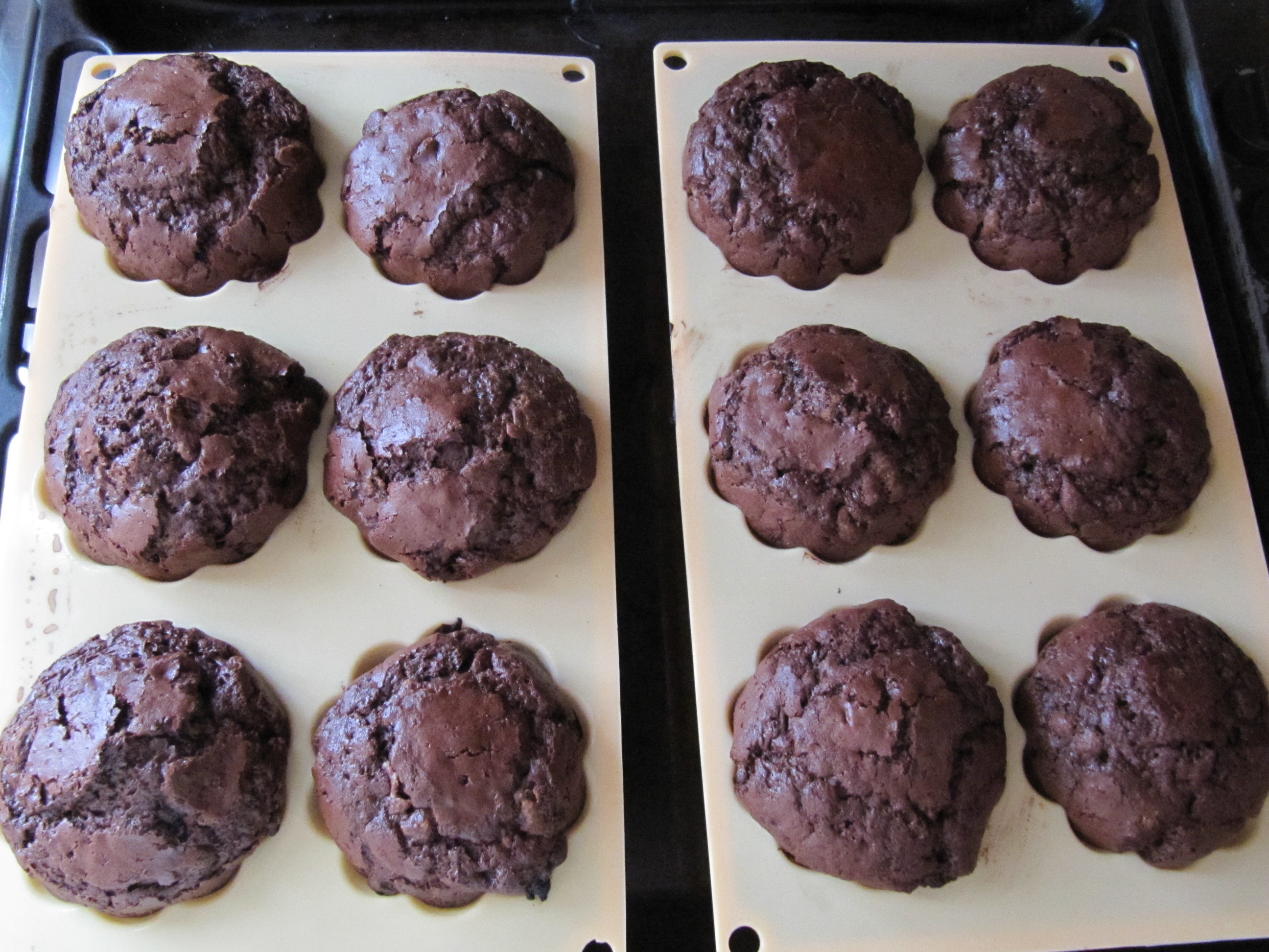 "antiorario" . Imburrare due stampi per muffin (se sono al silicone non è necessario) o inserire in ogni cavità un pirottino di carta. Versare l’impasto negli stampini (non superare i 2/3 della capienza), completare con altre gocce di cioccolato e cuocere in forno preriscaldato: 180°per circa 25 minuti.