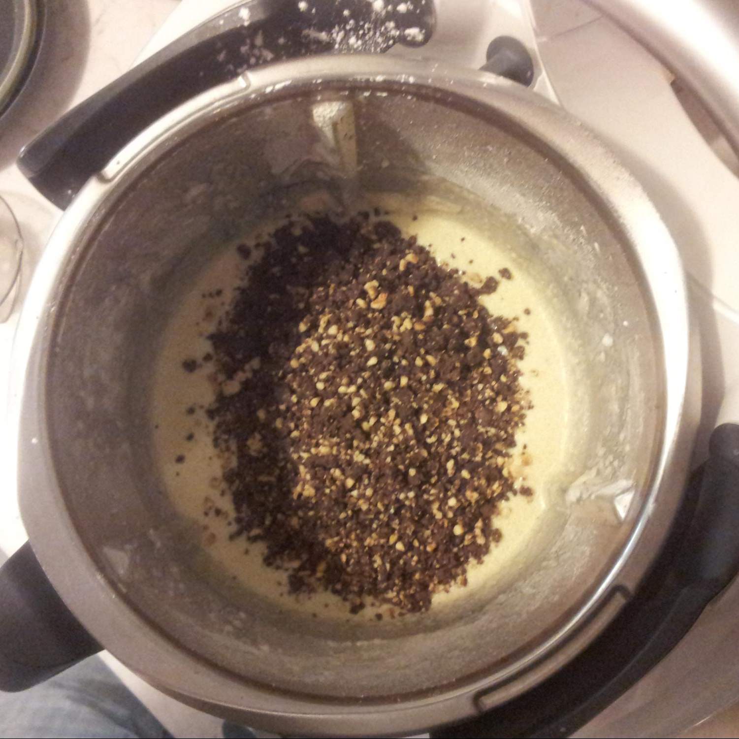 "coperchio chiuso" i cioccolato a pezzi e le nocciole. Tritare per 10 sec vel 5. Mettere da parte.