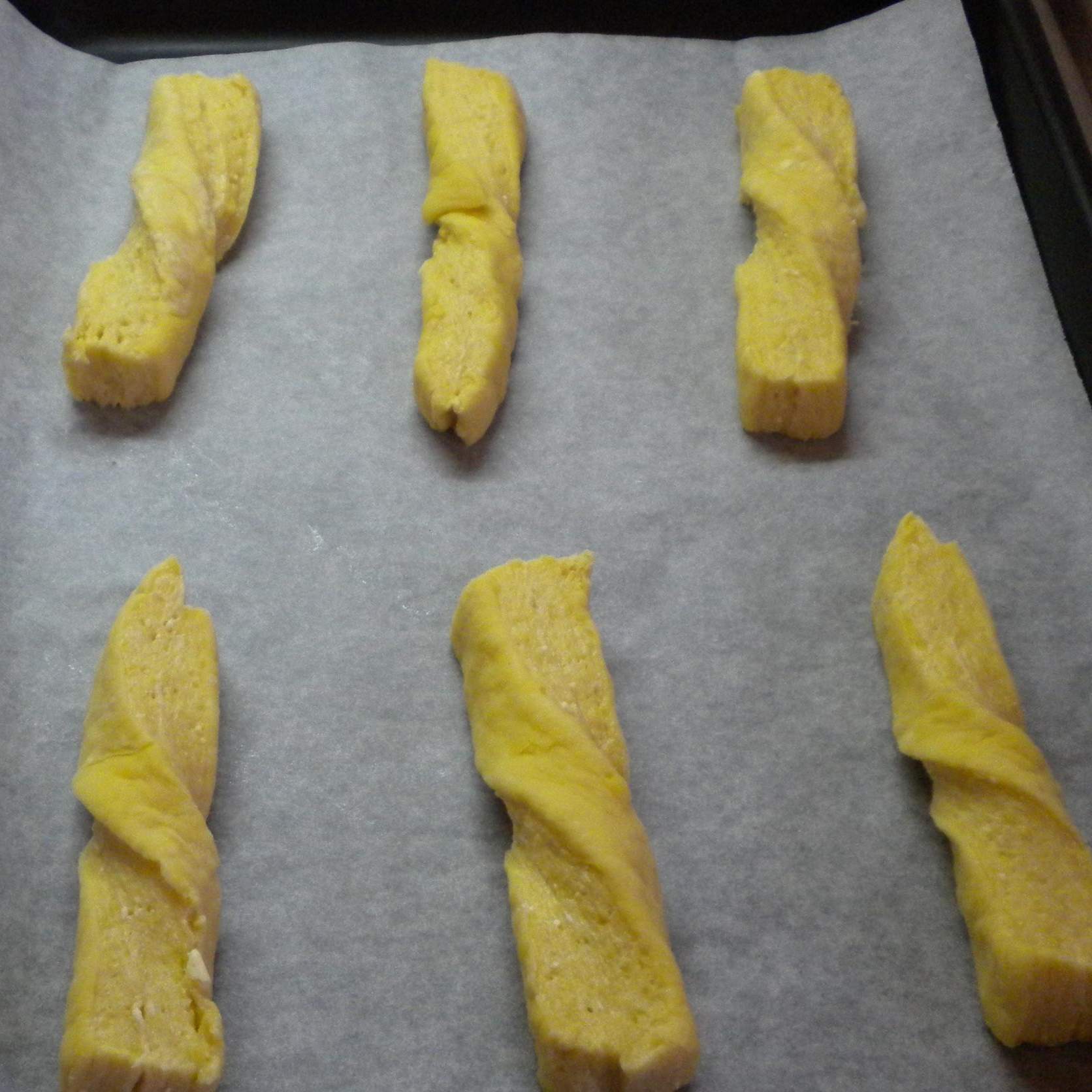 7. Attorcigliate ogni nastrino al centro con un mezzo giro. Adagiateli sulla placca da forno (ben distanziati), pennelateli con l'albume cercando di schiacciarli allargandolo un po' e cospargeteli con zucchero semolato (meglio se di canna). Lasciateli lievitare al caldo per 30/40 minuti, poi infornateli a 170° per 20 minuti.