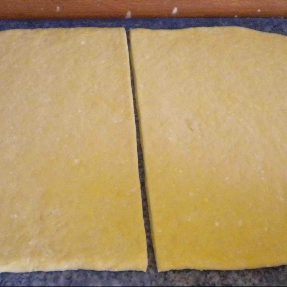 5. Riprendete la pasta e stendetela in un rettangolo 50x30 e 1,5 cm di spessore circa, poi tagliatelo in due rettangolo uguali.