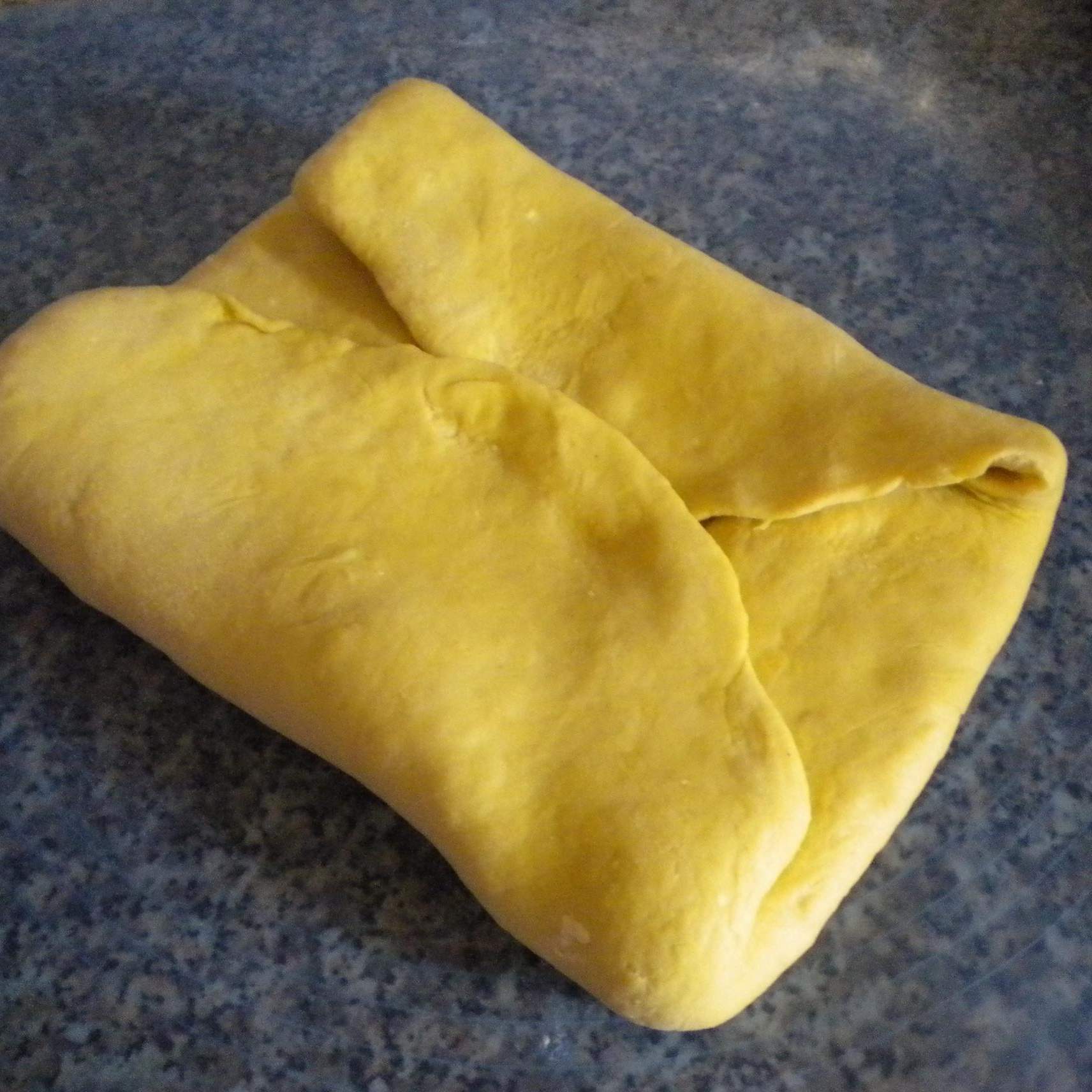 4. Ripiegate i 4 angoli della pasta sul burro a chiuderlo completamente. Stendete il panetto fino ad ottenere un rettangolo lungo circa 60 cm.