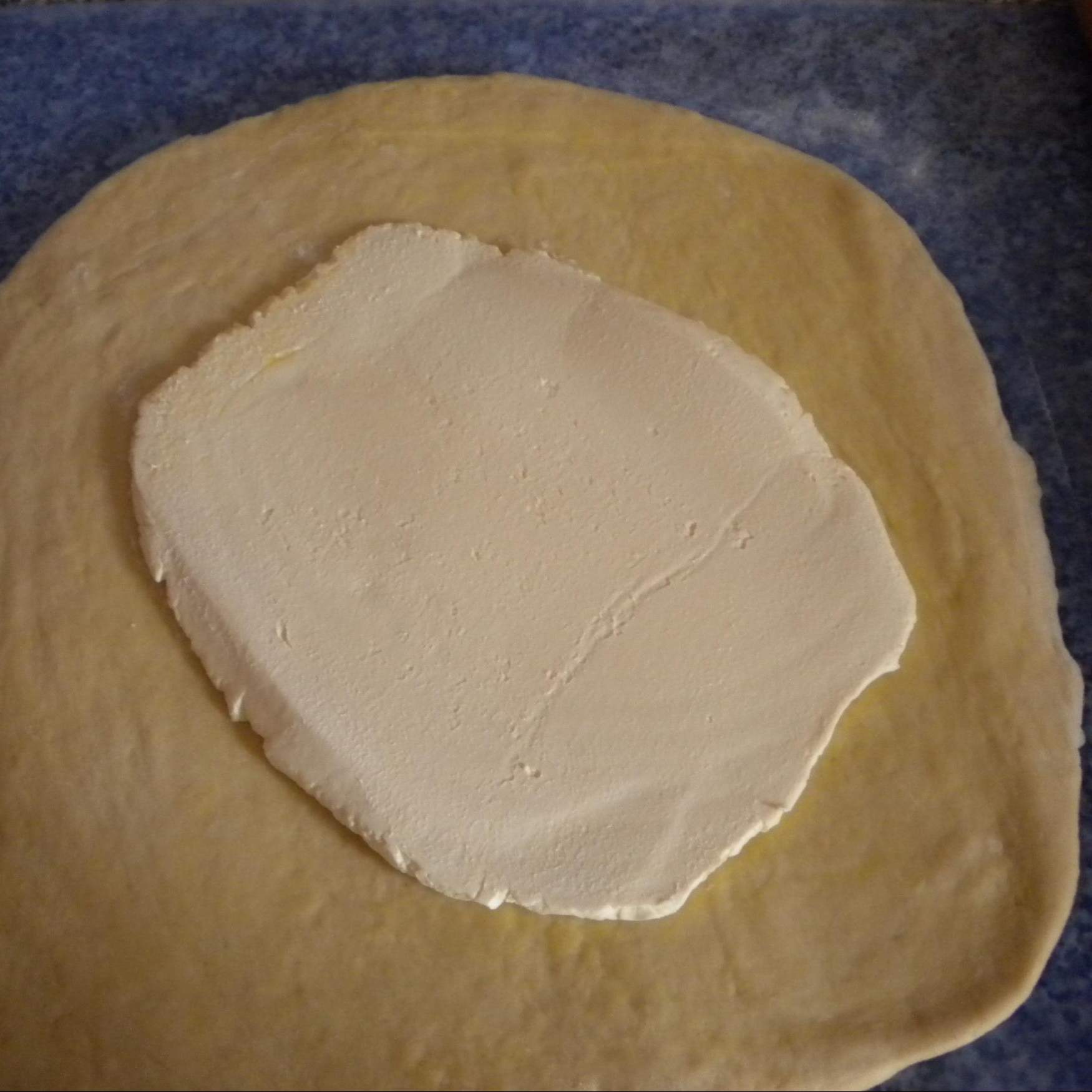 1° giro piega a tretmrc_emoticons.partendo dal lato corto del rettangolo ripiegate 1/3 della pasta su stessa, ripiegate verso il centro anche il lembo opposto. (siccome a me anzichè un rettangolo è venuto un quadrato ho ripetuto la stessa operazione 2 volte)Ponete la pasta in frigo per 30 minuti.