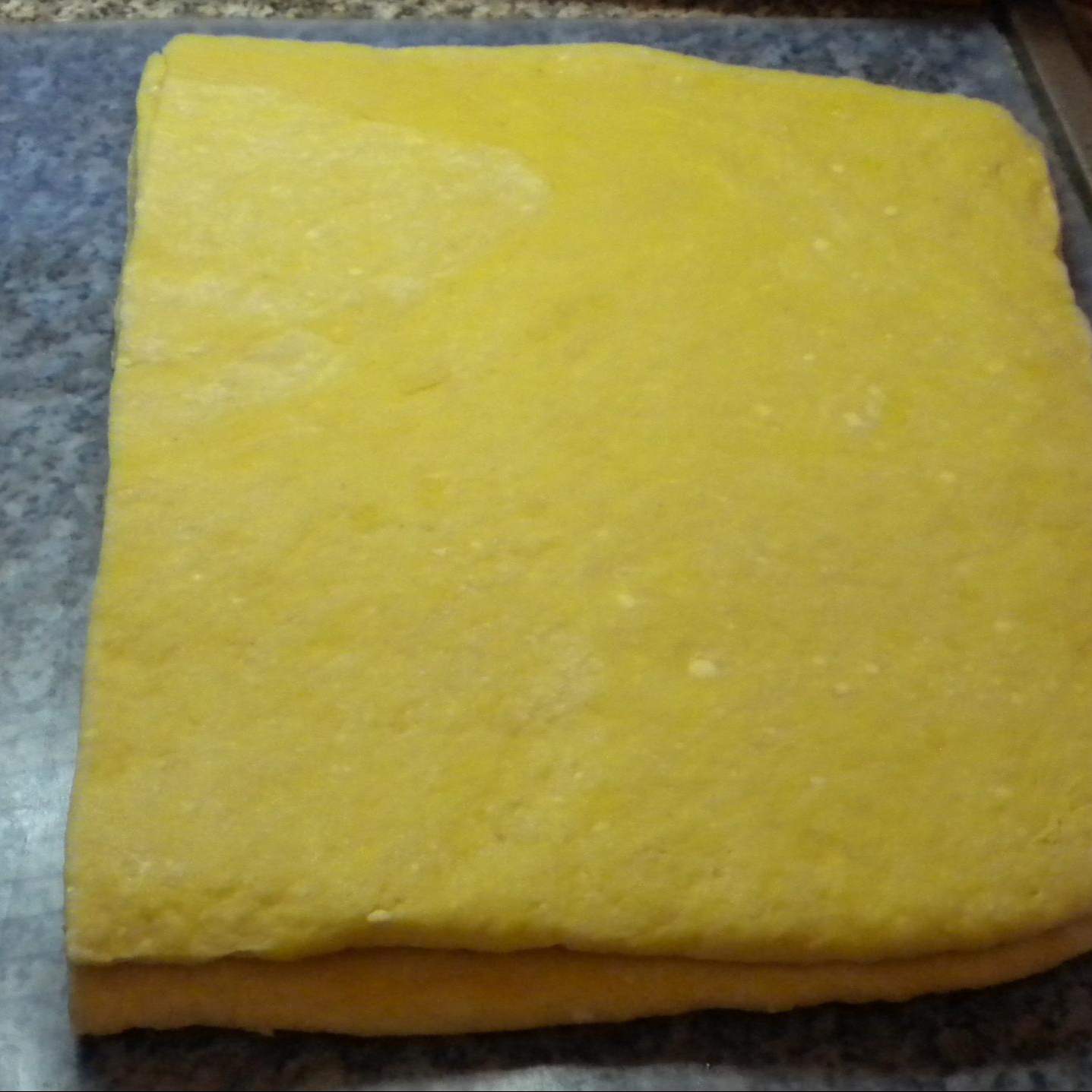 3. Riprendete la pasta, lavoratela per 1 minuto e stendetela in un quadrato di 30 cm di lato.
