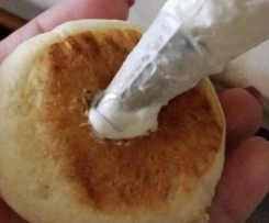 Sforniamo, foriamo la base della brioche ancora tiepide (non bollenti), infilziamo la punta della Sac a poche e riempiamo, così permettiamo alla mollica interna di fare spazio totalmente alla crema.