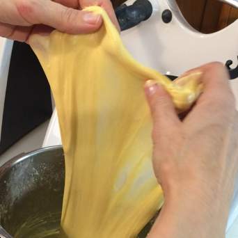 "velocità spiga" e il sale appena finiamo di inserire il burro. L'impasto va chiuso a una temperatura non superiore ai 26 gradi per questo meglio usare ingredienti freddi. Il risultato deve essere un impasto ben incordato, che faccia il velo (vedi foto). Quindi i tempi di impasto sono indicativi. Bisogna imparare a conoscere gli impasti osservandoli dal foro mentre il bimby è in funzione. - Mettere il primo impasto in una ciotola coperto con pellicola a lievitare a 25 gradi per 12-14 ore (deve triplicare di volume)