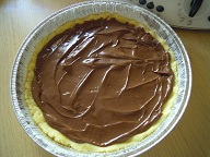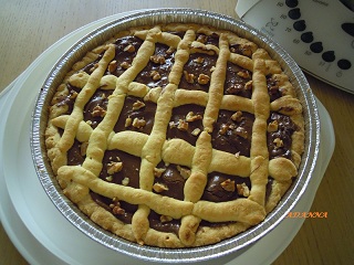Cospargere di nutella e mandorle tritate grossolanamente e con il restante impasto formare delle strisce da adagiare sopra.
