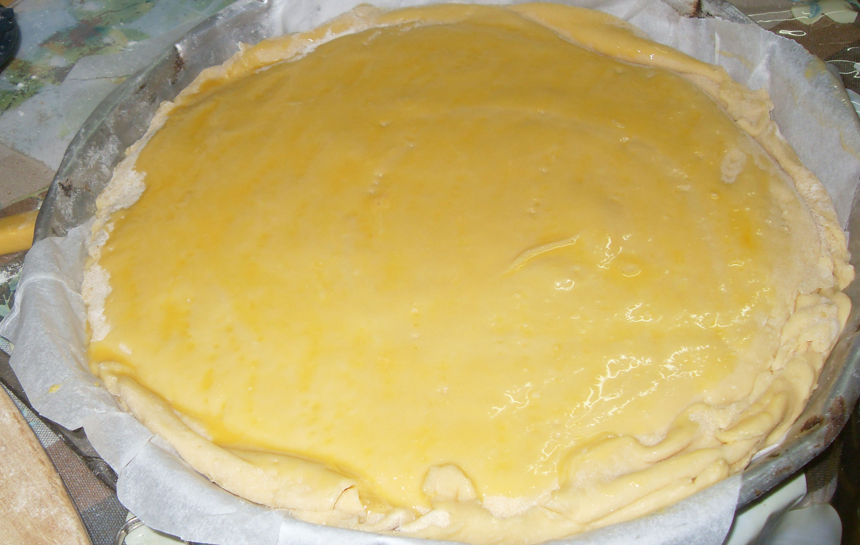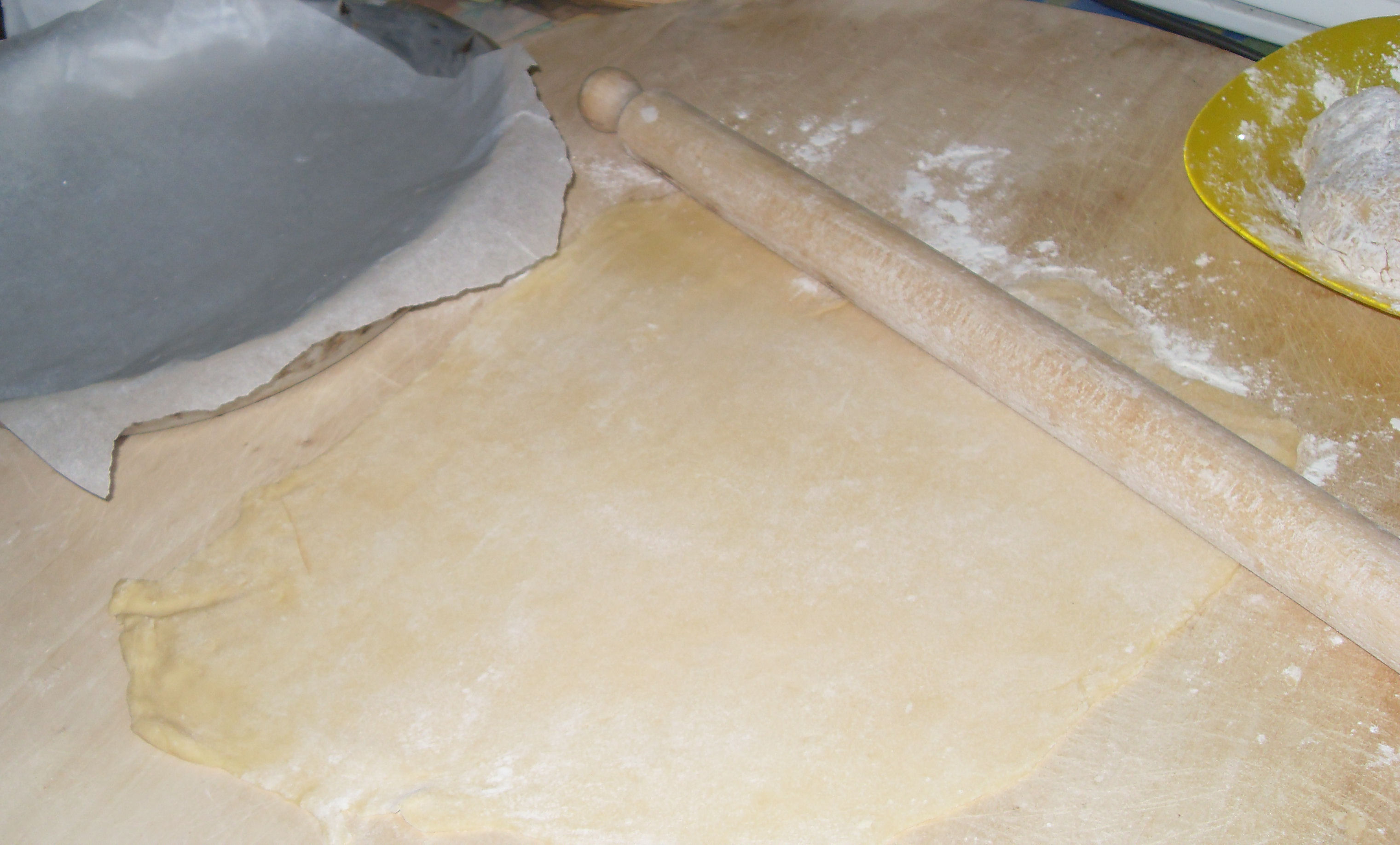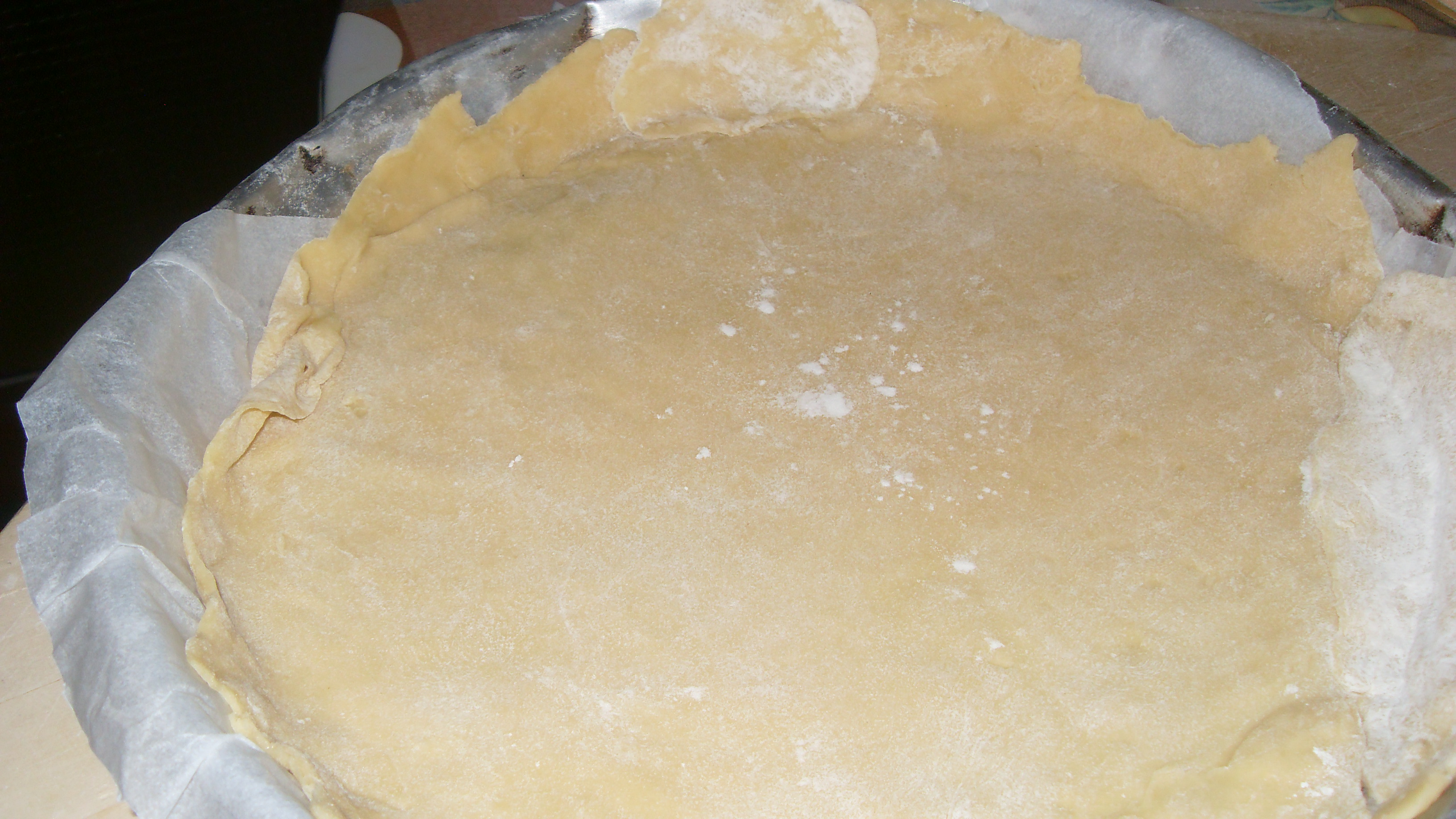 10. Foderare con una parte dell'impasto uno stampo rotondo, precedentemente rivestito con della carta forno.