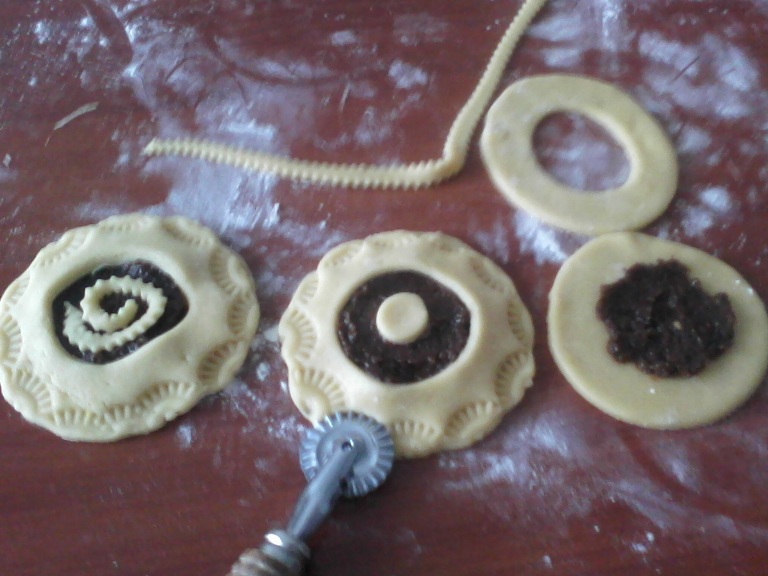 Stendere la pasta con il mattarello aiutandosi con la farina, la pasta deve essere morbida non dura, fare dei cerchi farcire e ricoprire con altro cerchio bucato .in forno 13- 15 min. a 200°.