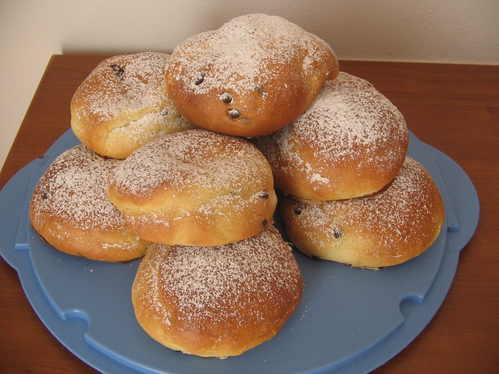 L'impasto è pronto, versarlo su una spianatoia leggermente infarinata incorporare le gocce di cioccolato e ricavare delle palline di c.a 50 gr che verranno disposte su una teglia da forno ricoperta di carta forno, lasciar lievitare ancora un ora circa spennellarli poi con un pò di latte e zucchero e cuocere a 160° ventilato per 15-20 minuti. Una volta raffreddati spolverare con zucchero a velo.