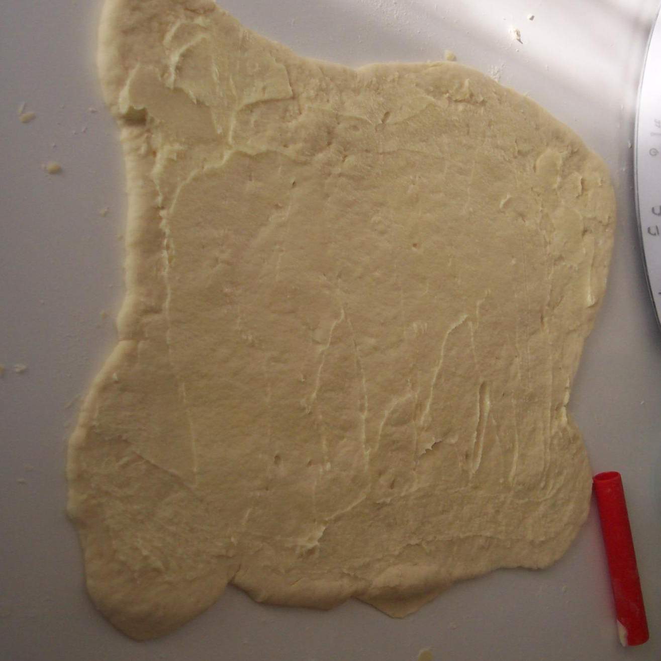 "velocità spiga" . Riporre l'impasto (che risulterà un po' appiccicoso ma lavorabile) in una ciotola di ceramica unta di burro, coprire con pellicola per alimenti e mettere a lievitare sino al raddoppio del volume (almeno un'ora).Una volta lievitato, rovesciare l'impasto sul piano da lavoro cosparso di farina e sgonfiarlo con le mani; stenderlo poi con mattarello sino ad ottenere un rettangolo alto circa 1,5 cm. Siate molto delicati perchè l'assenza di uova rende la pasta un po' meno elastica.