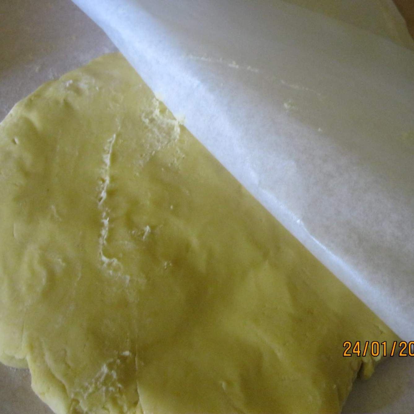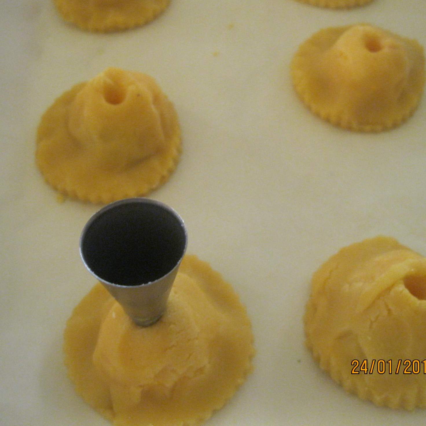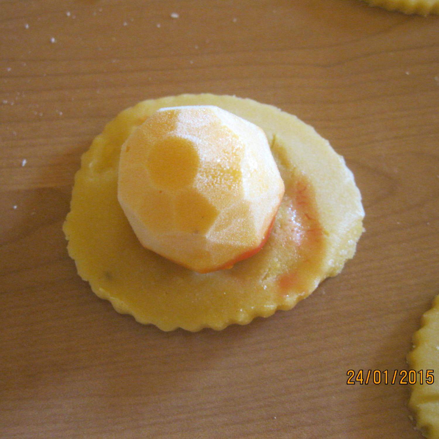 Nel frattempo stendere la frolla allo spessore di 2,5 mm e ricavate dei dischetti.Porre al centro del disco il ripieno congelato, ricoprire con un'altro disco.
