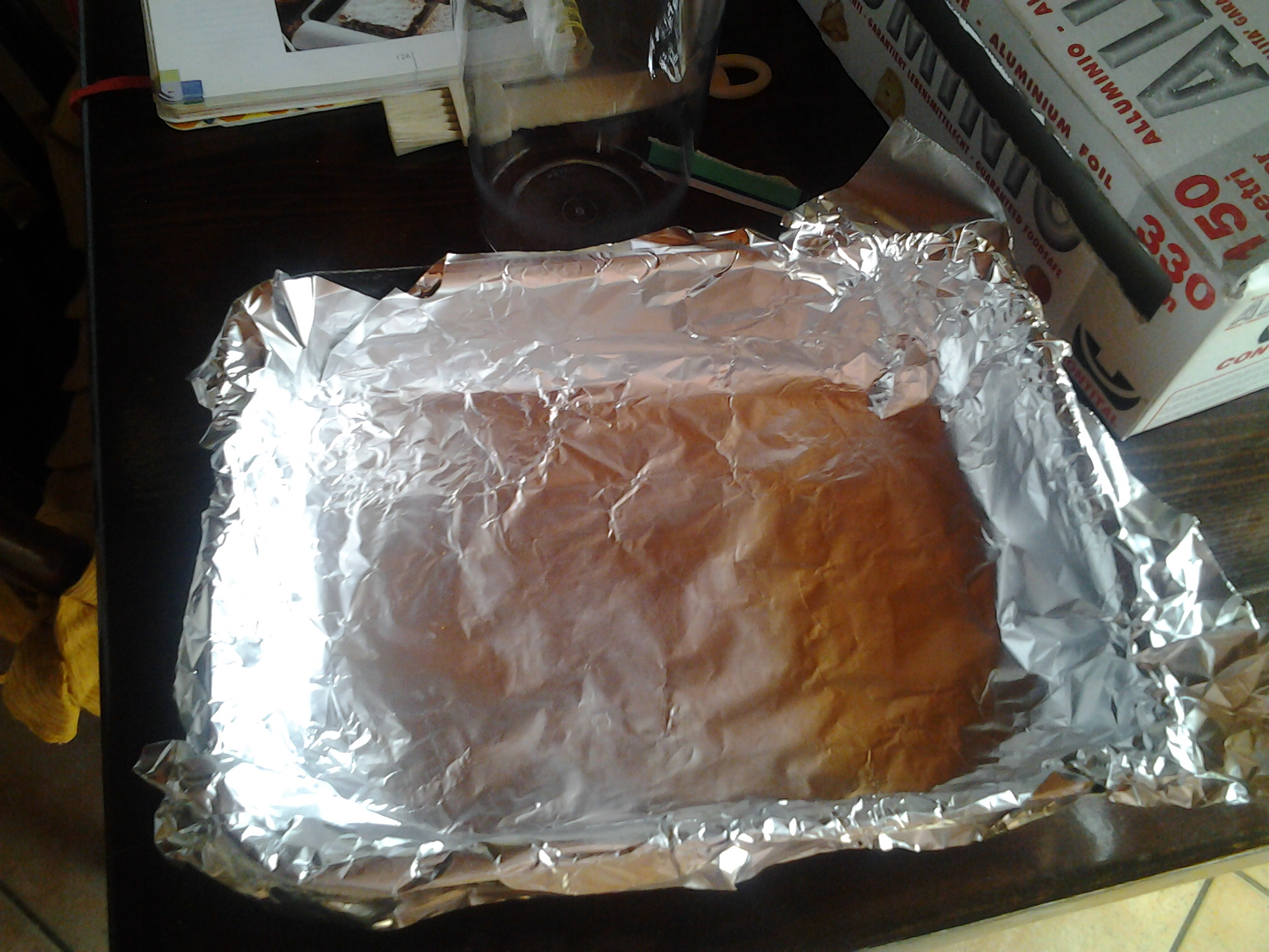 intanto foderare una teglia 6-8 porzioni con foglio d'alluminio e spennellarlo molto abbondantemente con i 30g di burro sciolto e torbido (non dimenticate i laterali);