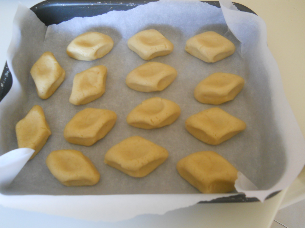 formare con le mani piccoli cilinretti ,schiacciarli e tagliarli a foma di rombo