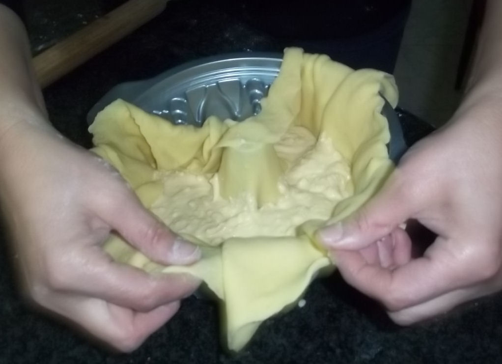 8. Ripiegare a fazzoletto i lembi di sfoglia che fuoriescono dallo stampo e sigillare bene il tutto.