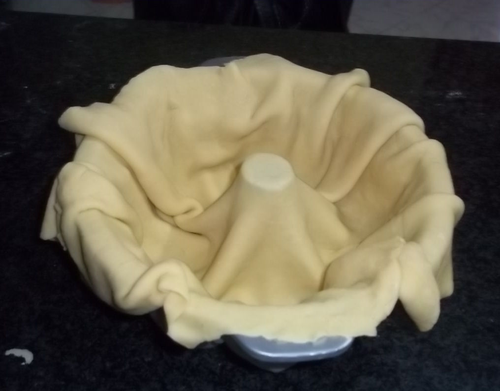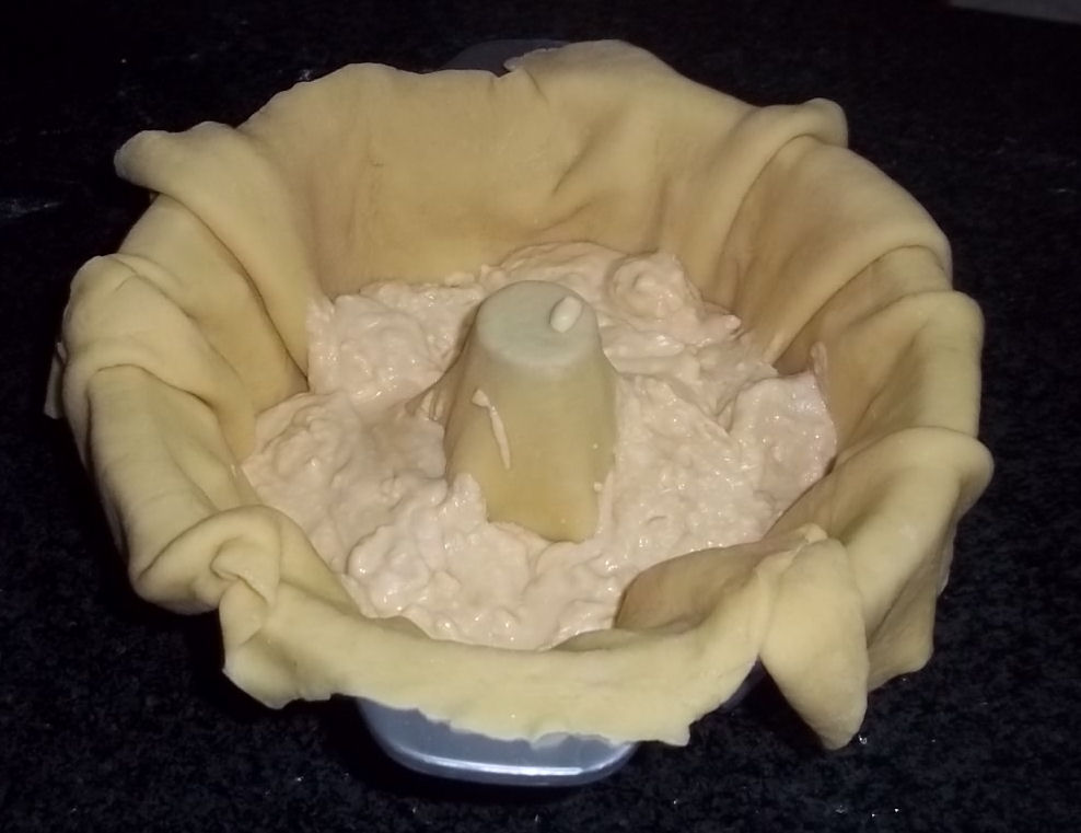 3. Rivestire con l'impasto uno stampo per ciambella, lasciando fuoriuscire dai bordi la sfoglia in eccesso (servirà per ricoprire la farcitura).