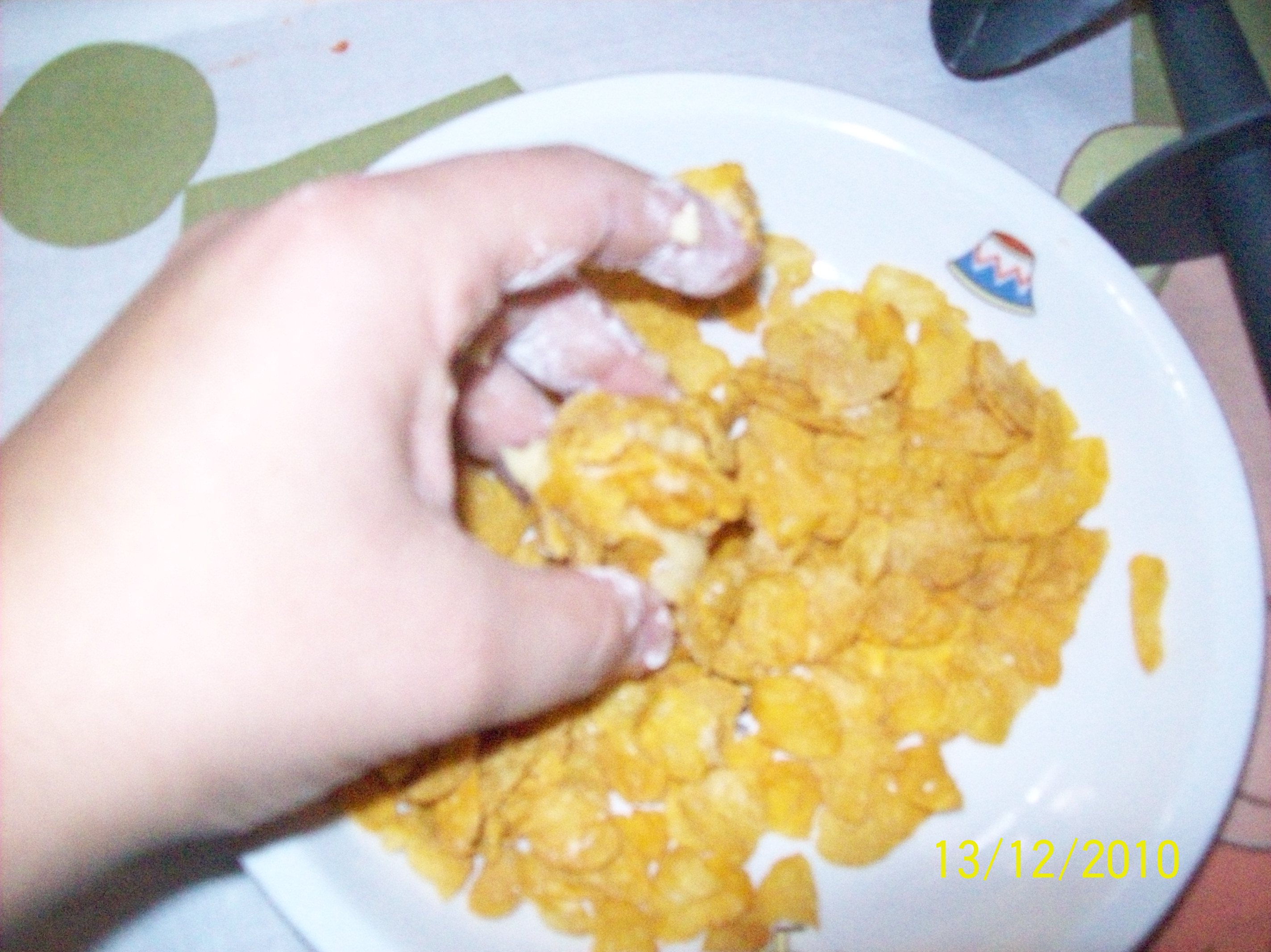 "velocità spiga" mettere i cereali in un piatto e con l'aiuto di un cucchiaio formare delle palline e lasciare cadere sui corn flakes aiutandosi anche con le mani
