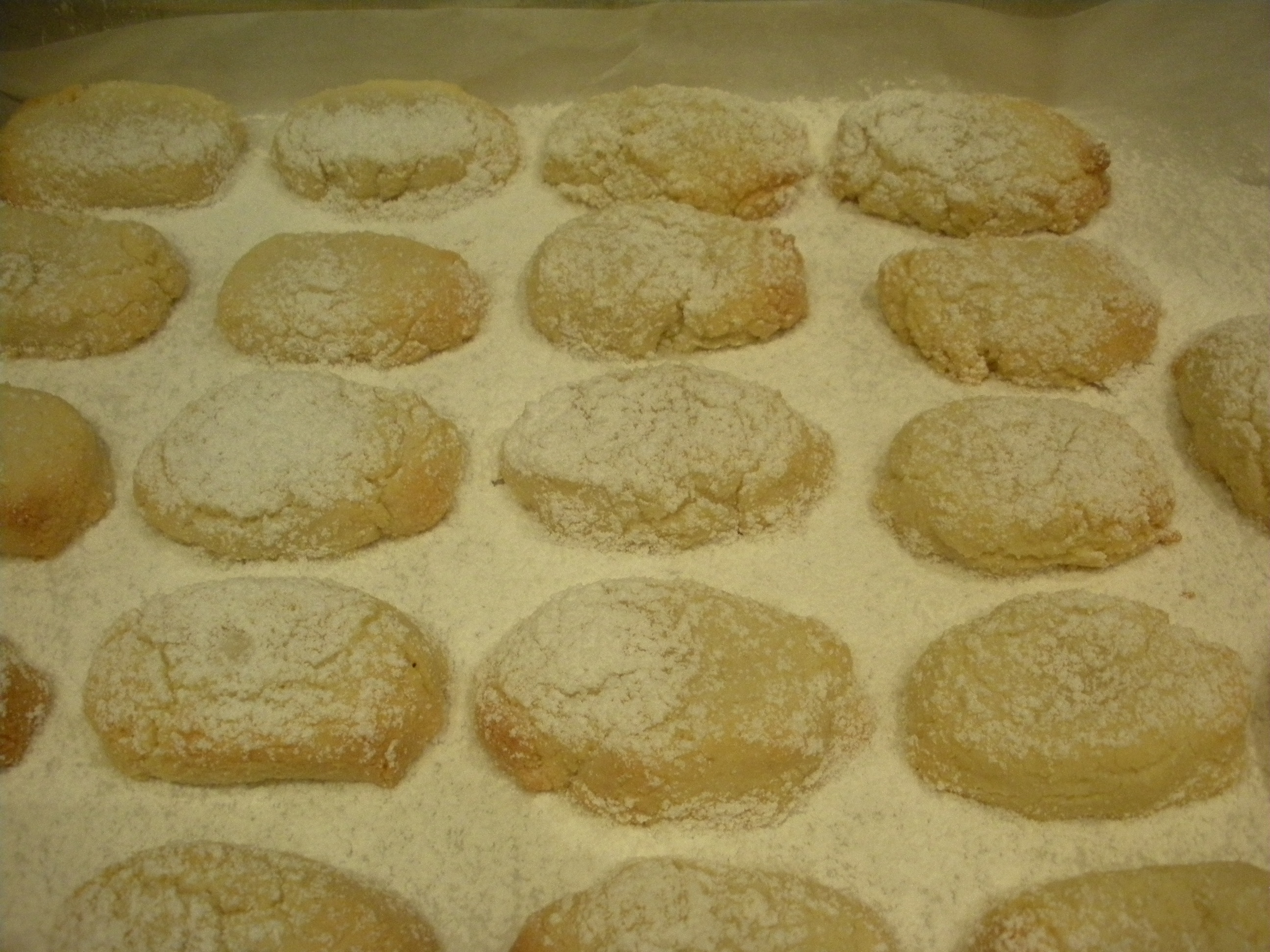 Adesso mettiamo lo zucchero a velo sopra e poi infornare 150° ventilato per 10 minuti non devono venire colorati (lo zucchero a velo che và messo prima di infornare i ricciarelli non è conteggiato nella ricetta, basta poco vedi foto