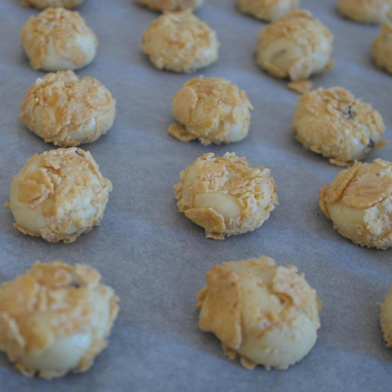 Con l'impasto formare delle palline e "impanarle" nei corn flakes un po' sbricciolati.