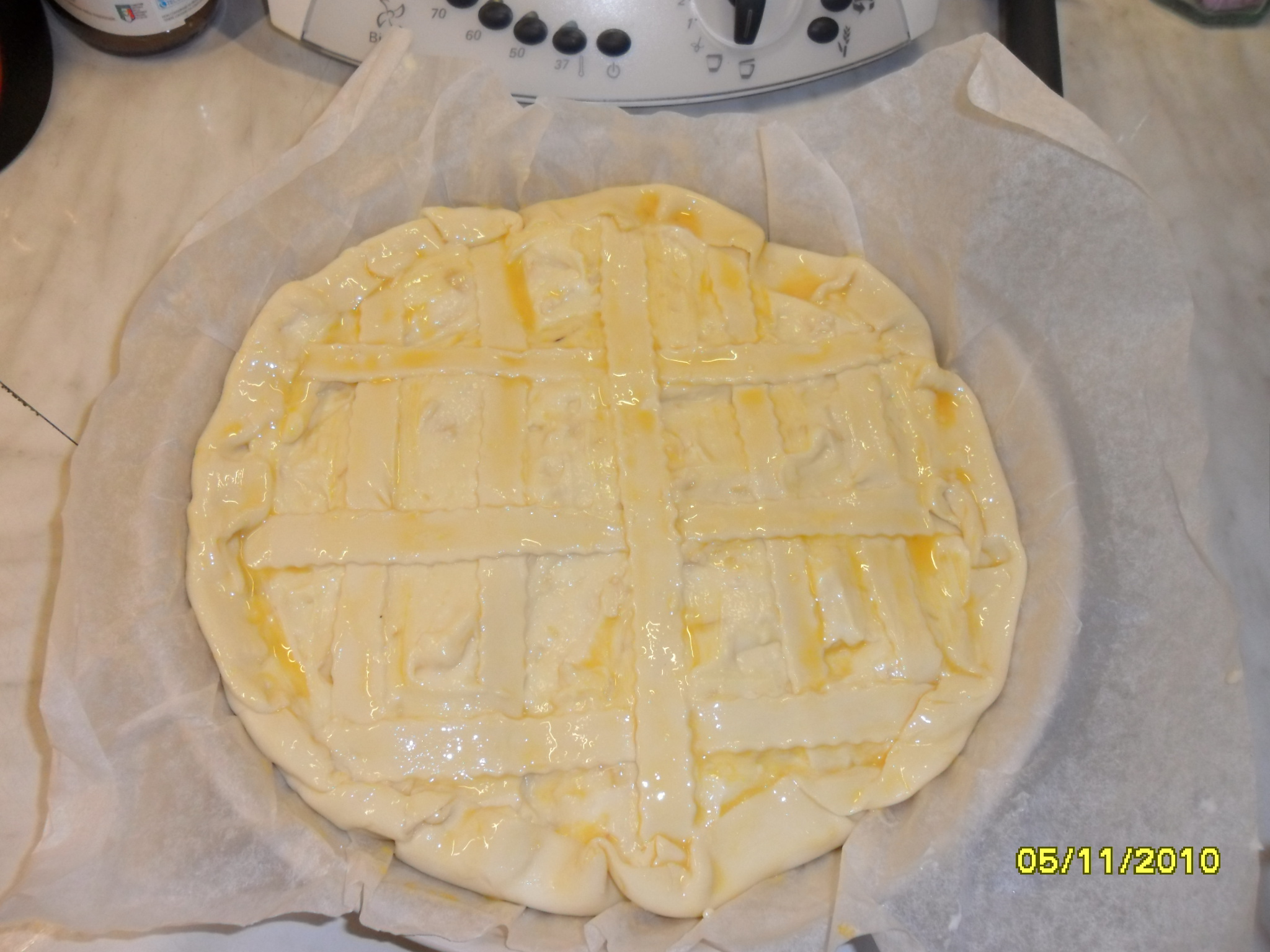 ricoprire con la carta forno una tortiera dal diametro di 24 cm.,stendere la sfoglia ed incorporarvi la crema.