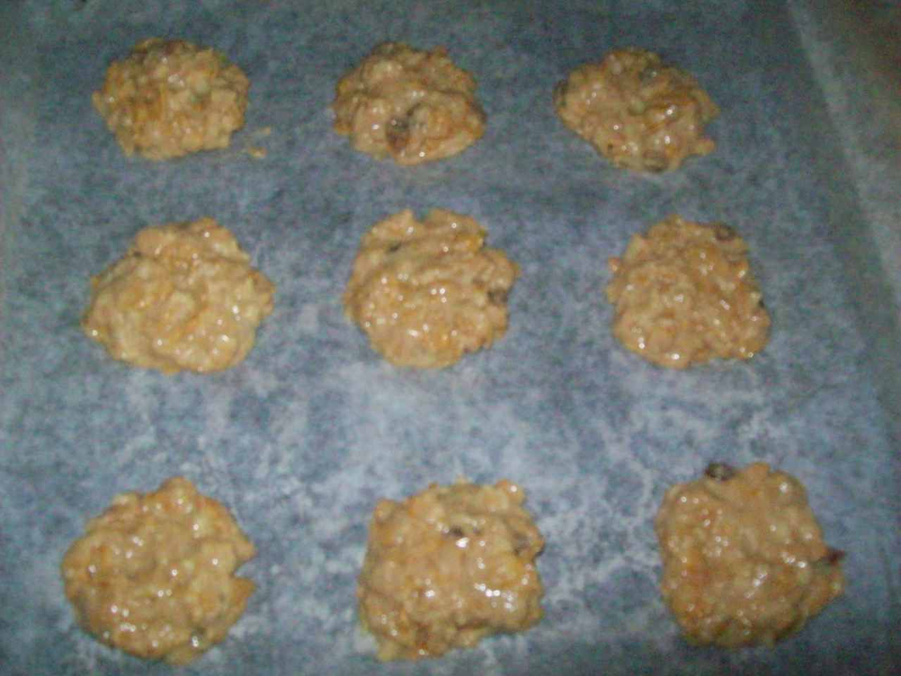 "coperchio chiuso" mettere la buccia di limone con lo zucchero rimanente: 10sec / vel 8. Aggiungere la farina, il lievito, la cannella, la margarina, l'uovo, il sale: 10sec / vel 5. Aggiungere l'uvetta e le mele: 10-12sec / vel 4, trasferire l'impasto in una ciotola, aggiungere i corn flakes, mescolare con un cucchiaio di legno. Foderare la teglia con la carta da forno, distribuire a cucchiaiate l'impasto ( vedi foto). Cuocere nel forno caldo: 10-15min / 200°.