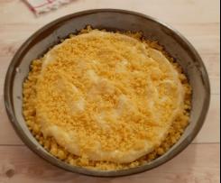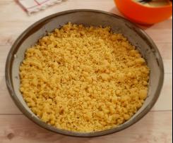 - Oleare e infarinare una tortiera e senza compattarle distribuire 2/3 delle briciole per ricoprire tutto il fondo.