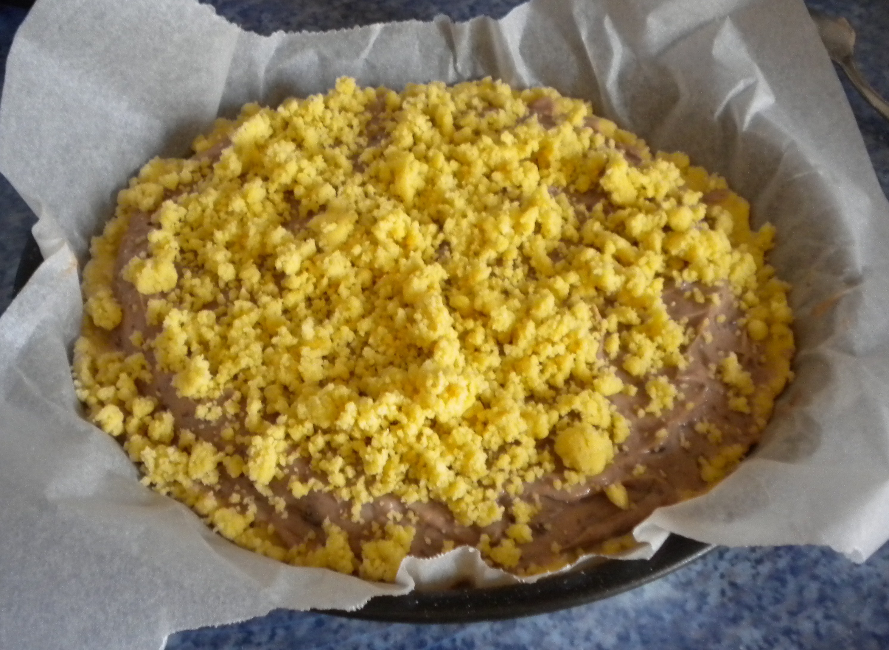 Preparate la crema mettendo le uova, il dolcificante, il latte e la fecola 4-5 min 90° vel 4. Con la fecola viene  bella densa quindi aggiungete la crema di nocciole e mescolate qualche sec a vel 3, se la crema perde la densità non vi preoccupate mettela a raffreddare in frigo e tornerà densa. Tritate il cioccolato qualche sec vel turbo quindi aggiungetelo alla crema e mescolate, versate nella tortiera lasciando liberi un paio di centometri dal bordo. Mettete sopra il resto delle briciole cercando di coprire il più possilbile la crema e chiudere bene intorno. Infornare a 180° per circa 30-40 min.