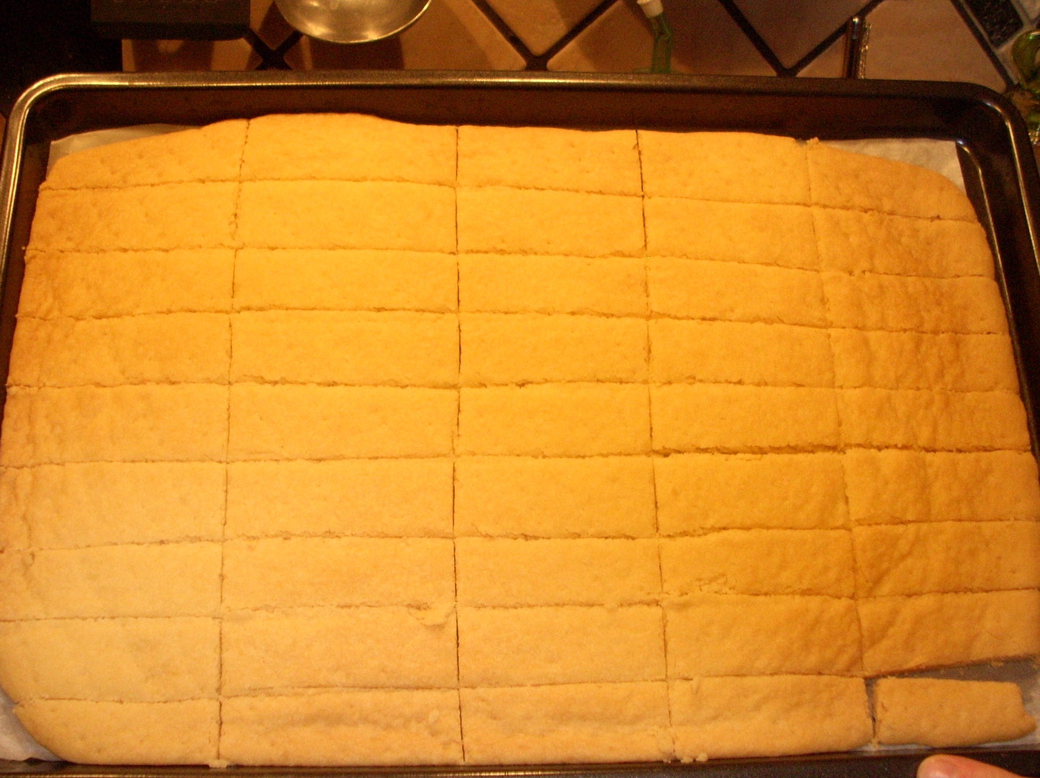 Mettere in forno caldo a 160° per circa 30 min. (regolarsi col proprio forno), fino a che saranno leggermente dorati, ma ancora molto chiari. Togliere dal forno e, quando sono ancora tiepidi, tagliarli seguendo le incisioni fatte in precedenza. Lasciar raffreddare completamente.