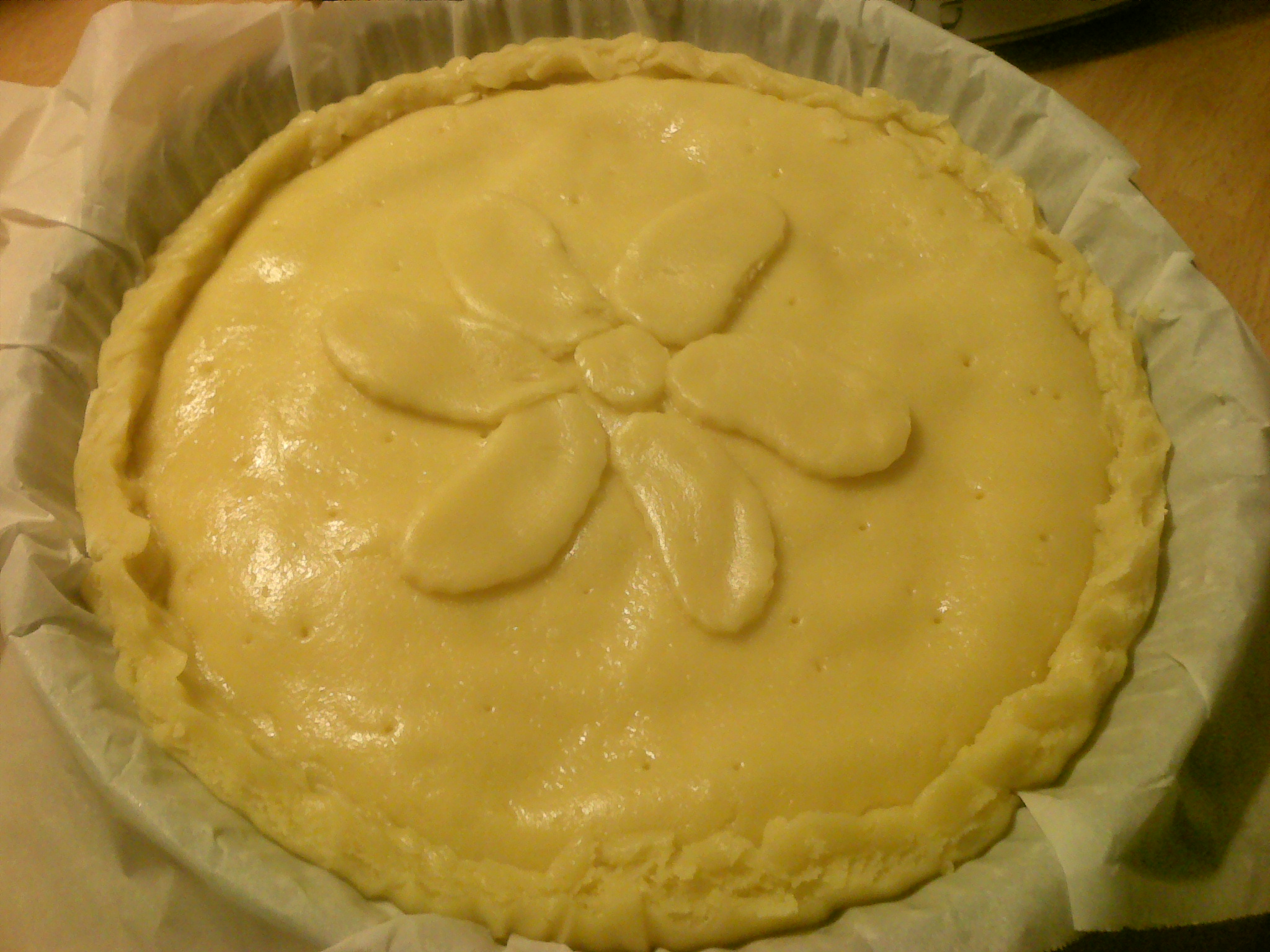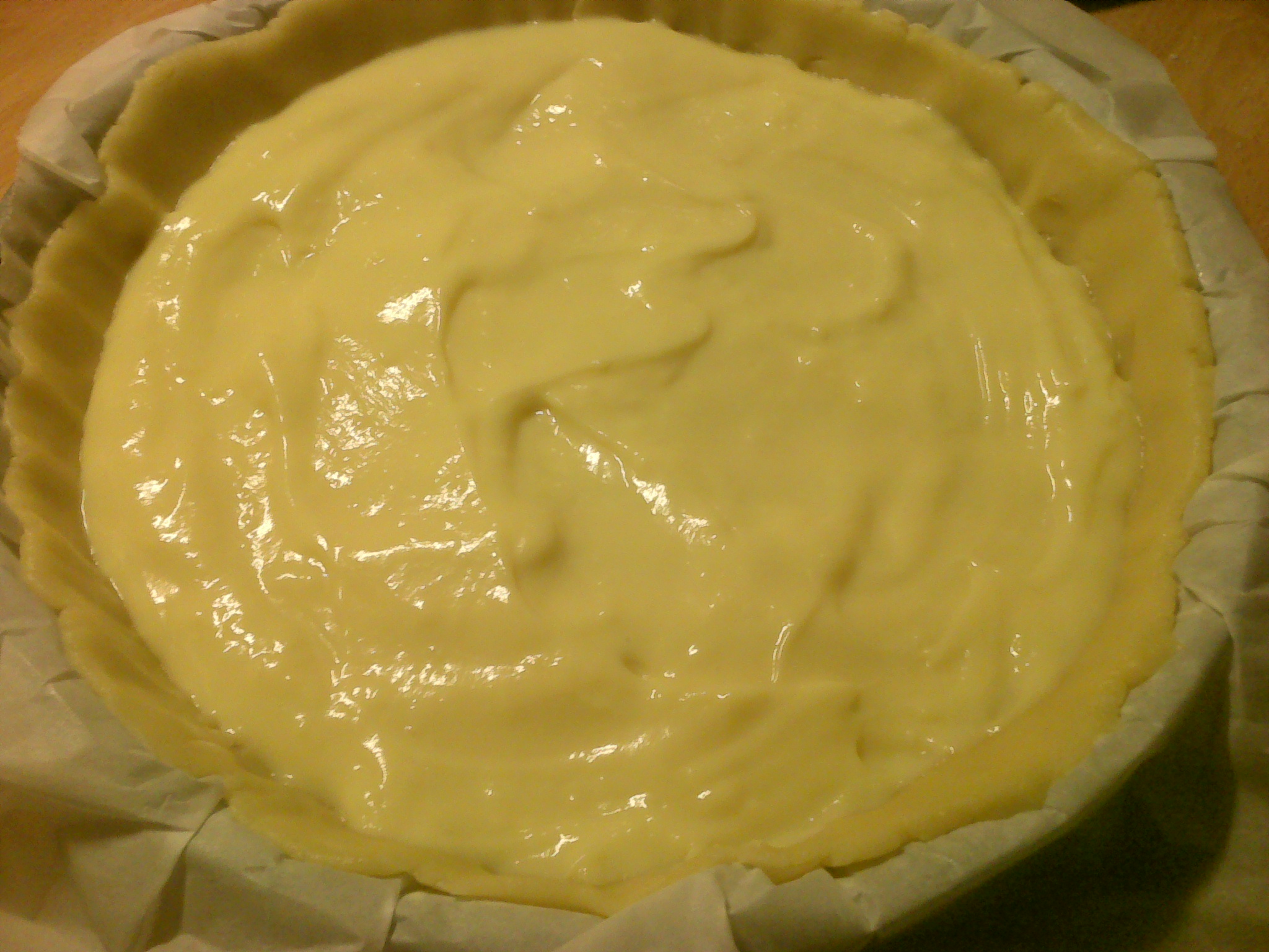 Stendi le due sfoglie sulla carta da forno, quella più grande la metti sotto con tutta la carta da forno in una tortiera da crostata da 22 cm. di diametro,versa all'interno la crema fredda e copri con l'altra sfoglia.sigilla i bordi, decora ed inforna a 180°per 30 minuti circa. prima di sformarla deve essere freddissima,(altrimenti si crepa,come è successo a me!) spolverizzare con zucchero a velo e servire.