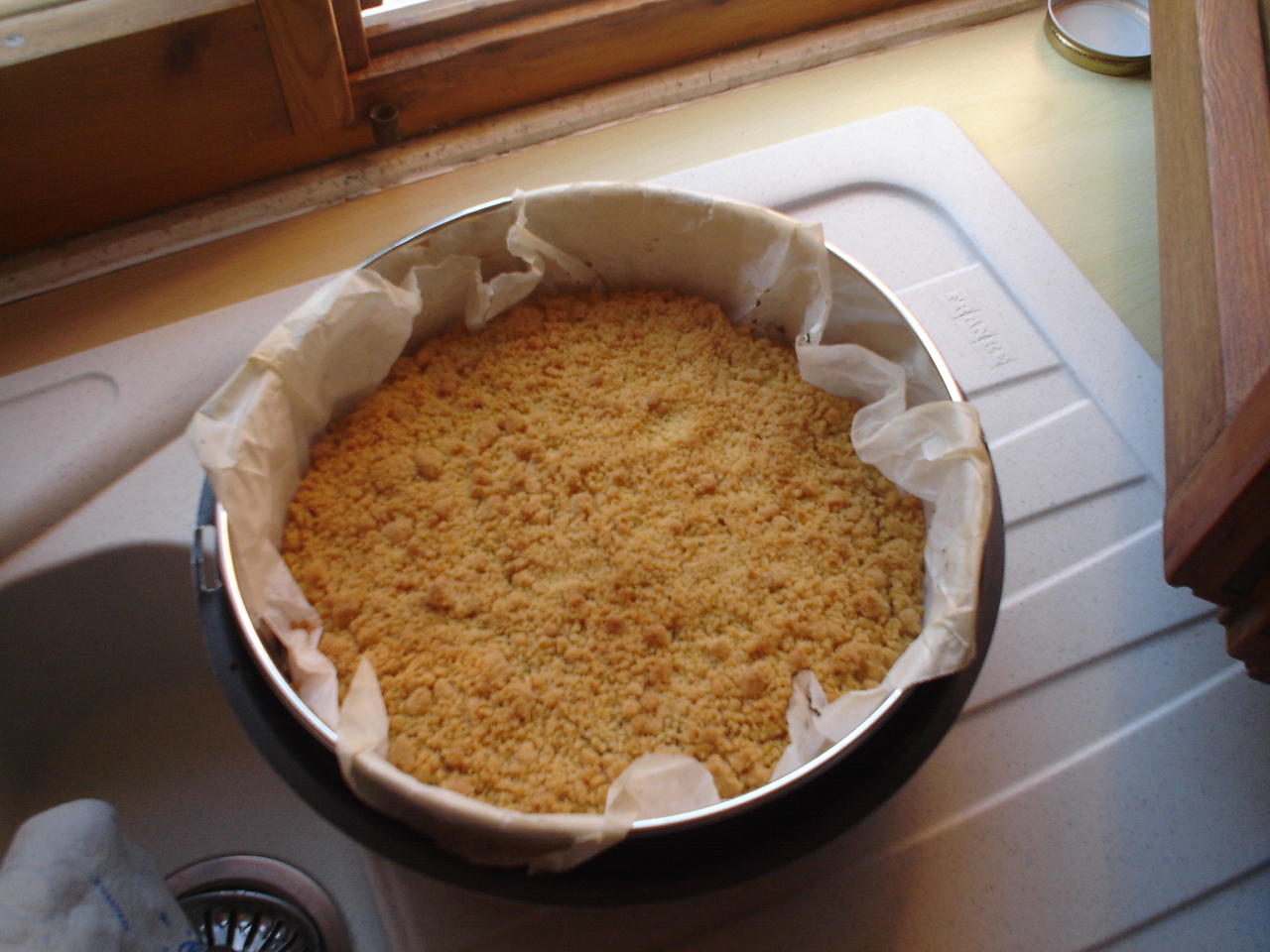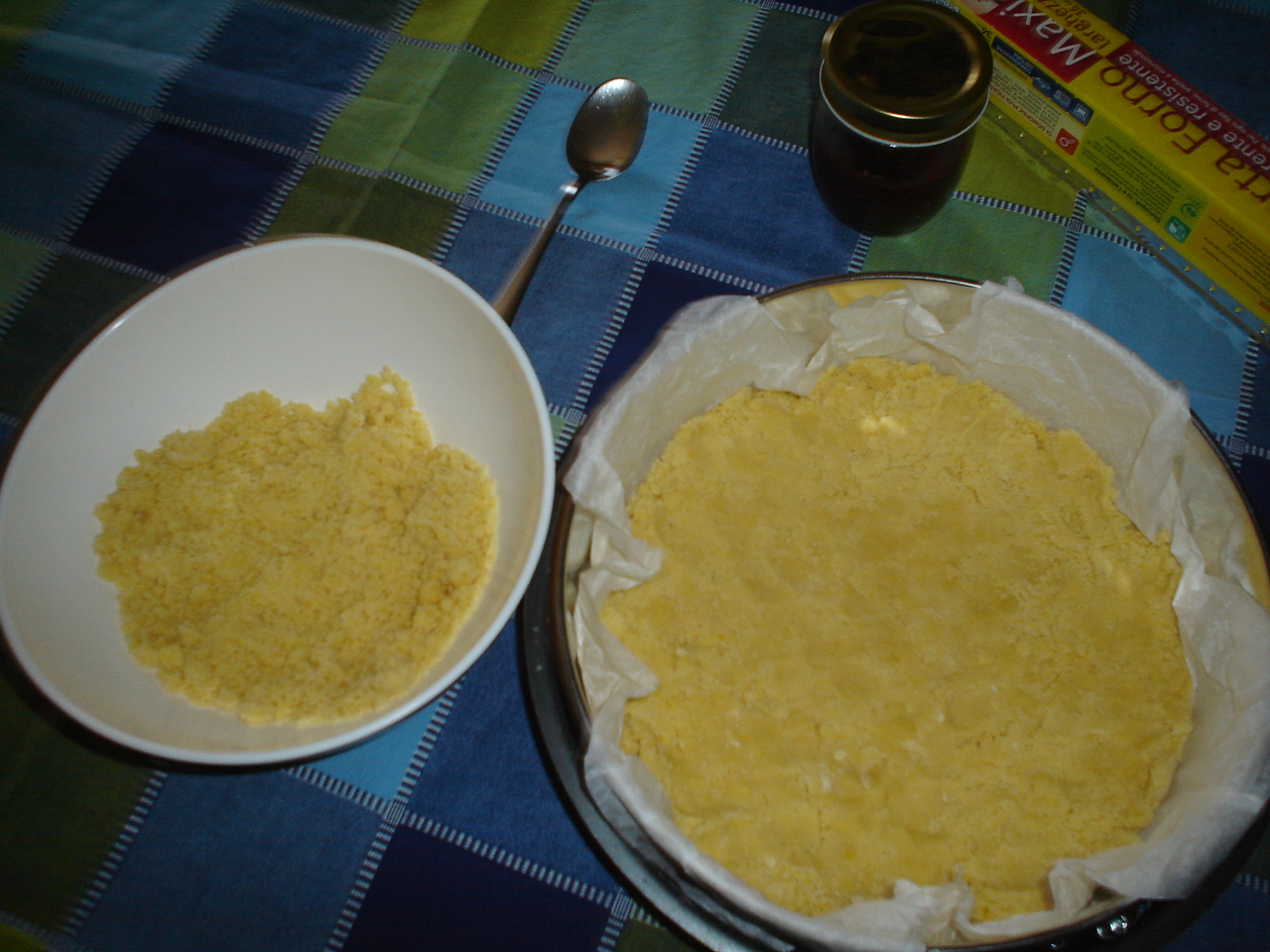 Con metà dello sfarinato, foderate una tortiera coperta con carta da forno (o imburrata, come meglio vi piace). Sopra la base ottenuta spalmare la marmellata (io quella che mi ha regalato la mia gemellina Lully, di fichi e cacao). Se piace sopra spargere granella di mandorle o nocciole, ma non è contemplato dalla ricetta originale, a me piace e l'ho fatto,