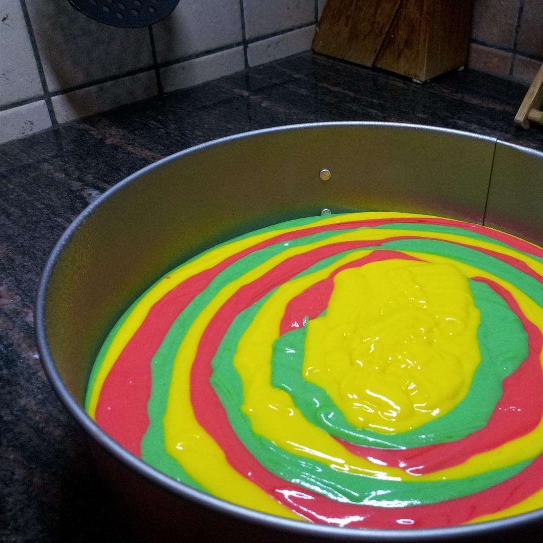 Versare ogni colore al centro di una teglia rotonda imburrata e infarinata.